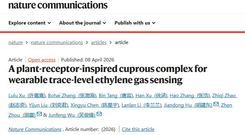农业传感器科技创新团队在Nature子刊《Nature Communications》在线发表了题为“A Plant-receptor-inspired Cuprous Complex for Wearable Trace-level Ethylene Gas Sensing”的研究论文。该研究受植物乙烯识别机制启发,研制出仿生乙烯传感核心单元,并以此构建了柔性可穿戴传感器。该器件无需贵金属,检测限低,兼具快速响应、高选择性与长期稳定性,为智慧农业和化工产业中的痕量乙烯监测提供了关键技术支撑。