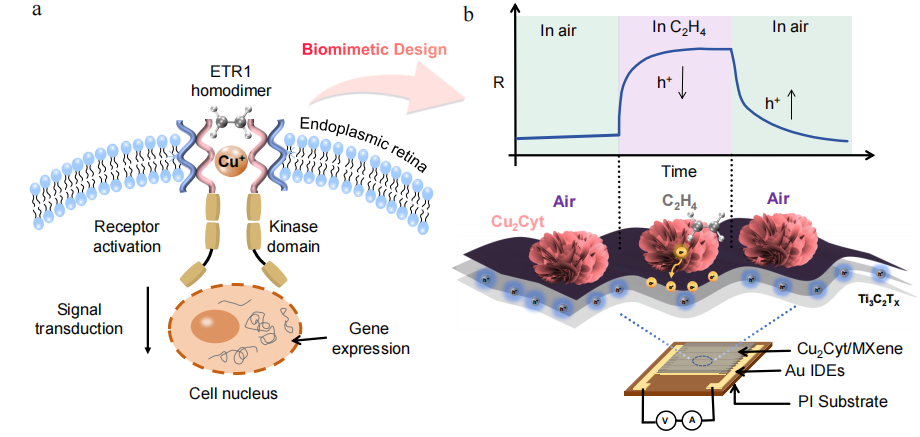 为实现高效的信号转导,将Cu₂Cyt与2D半导体材料MXene进行复合,构建了异质结传感结构。通过多尺度表征手段与理论计算,系统阐释了其中的级联电子转移传感机制:当乙烯分子被Cu+活性位点特异性捕获后,电子首先从乙烯分子传递至Cu2Cyt,随后进一步转移至p型半导体MXene基底。这一过程会降低MXene中的空穴载流子浓度,从而引起电极电阻发生规律性变化,最终实现对乙烯气体浓度的精准监测。