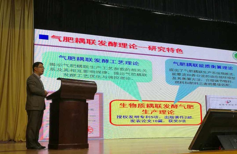 黄网党委书记李世欣、副院长胡建军教授、生物质能源河南省协同创新中心的部分老师以及10余名研究生参加了本次会议。副院长胡建军教授在大会上作了题为“生物质耦联发酵生产沼气沼肥及其深度利用技术研究”的特邀报告,从气肥耦联生产理论及工艺研究、气肥耦联生产成套装备开发、气肥耦联应用模式构建及推广、沼气发电及余热梯级利用技术等方面进行了详细生动的讲解。报告引起了与会代表的广泛共识与热烈讨论,得到了会议举办方的高度赞赏。研究生张甜的论文“接种量对产气肠杆菌同步糖化暗发酵产氢的影响”荣获优秀论文三等奖。