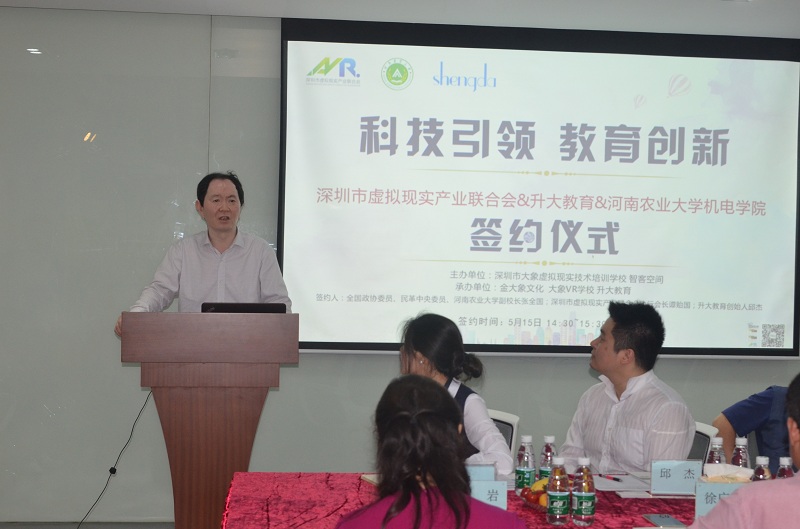 5月15日,黄网与深圳市虚拟现实产业联合会、深圳升大教育科技有限公司战略合作框架协议联合签署仪式在深圳市智谷科技园举行,共同确定联合成立VR教学创新示范中心。张全国副校长应邀出席,徐广印院长和部分教师代表参加签约仪式。