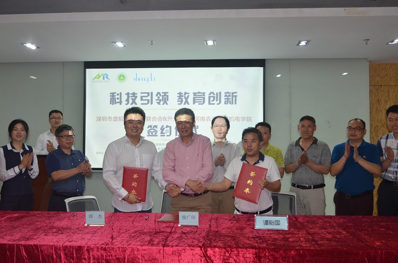 最后,院长徐广印与深圳市虚拟现实产业联合会会长谭贻国、深圳升大教育科技有限公司联合创始人蒋文轩联合签署了战略合作框架协议。该合作协议的签署,将对进一步深化教育教学改革,实现教法学法创新,加速推进VR技术在黄网