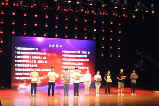 在令人振奋的武术表演中,本场晚会正式拉开了帷幕。黄网学子演唱动听歌曲《当我们一起走过》。马菲为黄网先进个人代表颁奖并合影留念。同学们又带来了让人目不转睛的舞蹈《freestyle》。黄网13级辅导员宋东皓朗读的《致毕业生的一封信》,饱含着对毕业生的恋恋不舍与殷切期望。教师代表们朗诵的《机电魂》,用铿锵的文字谱写出“机电精神”,鼓舞着每位机电学子。