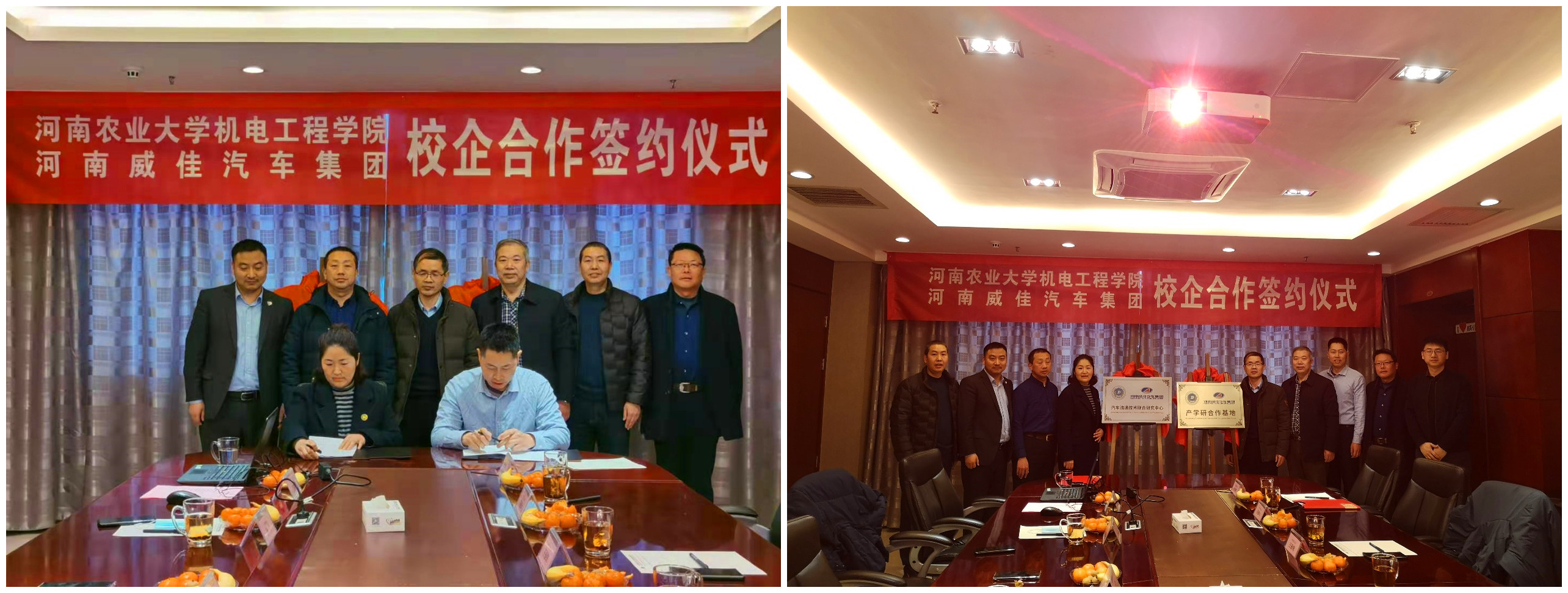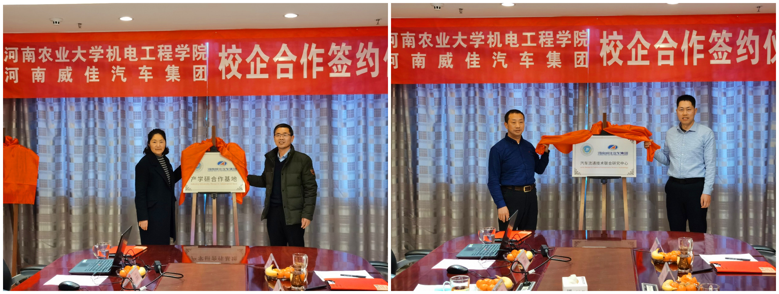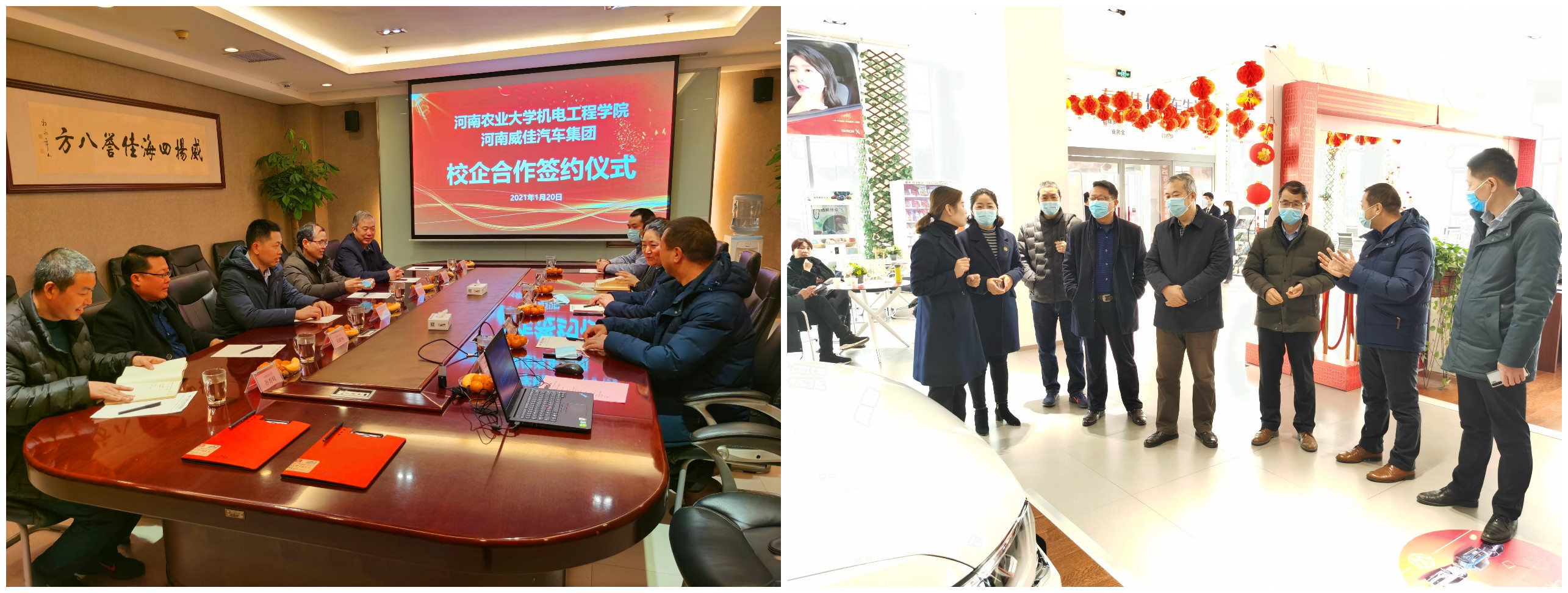 1月20日上午,黄网与河南威佳汽车集团合作建立的“产学研合作基地”、“汽车流通技术联合研究中心”签约及揭牌仪式在河南威佳汽车集团举行。院党委书记李世欣,副院长王振锋,李冠峰教授以及相关专业负责人,河南威佳汽车集团人力资源总监赵敏杰和售后服务总监孙立、以及相关部门负责人出席签约仪式。