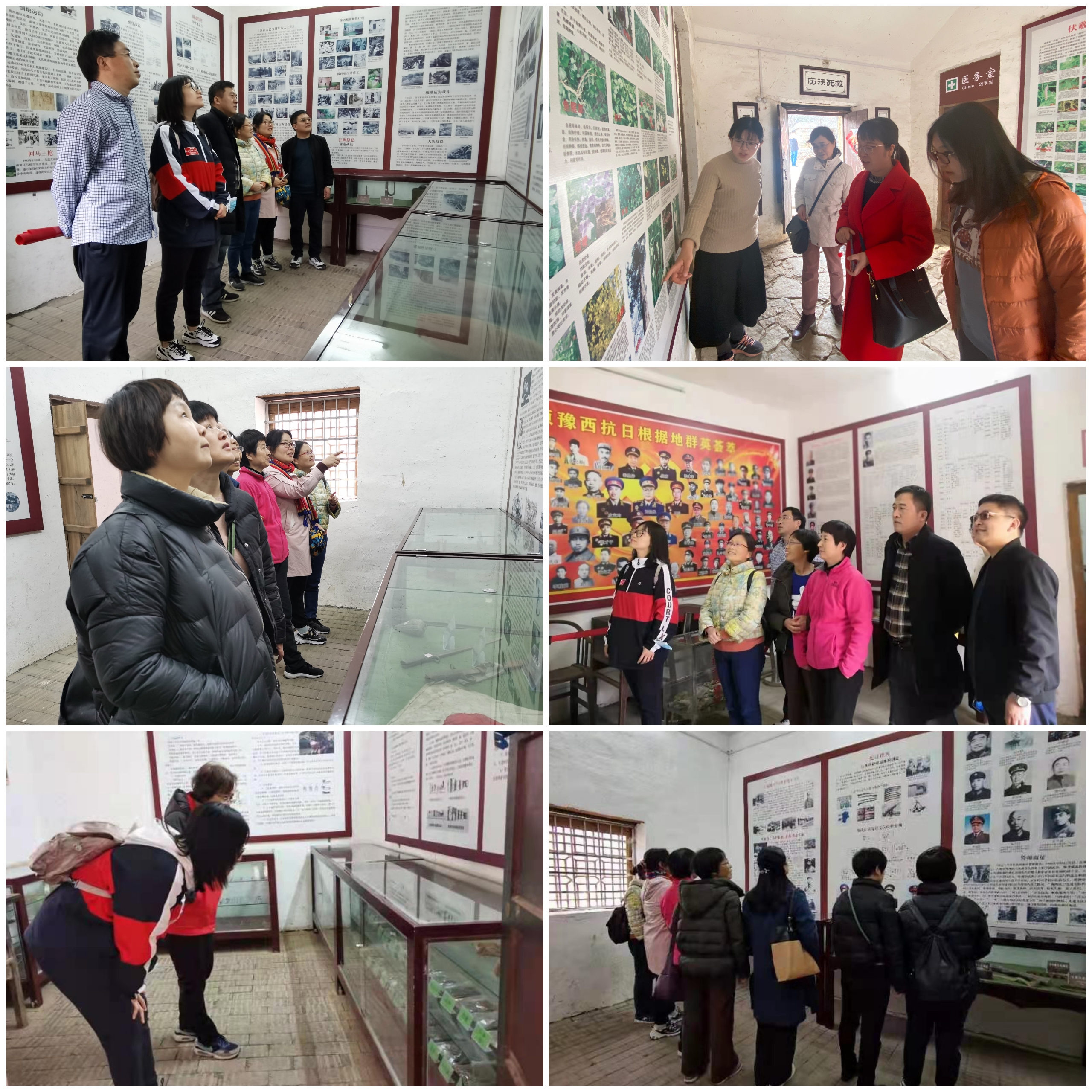 同时,讲解员通过文物、图片及人物事迹等大量关于豫西抗战时期的实物资料,细心的为教职工们讲解了皮定均司令员、徐子荣政委率领八路军先遣支队突破重围,在田种湾村设立司令部,进行反"扫荡"、打土顽、攻寨堡等抗日斗争活动,生动再现了中原豫西广大军民在党的领导下坚持抗战的英雄风采。教职工们纷纷驻足,认真观看英雄事迹展报墙、抗日纪念物展柜、抗日根据地群英荟萃图,致敬革命英雄和革命精神。最后,全体教职工进行合影留念。
