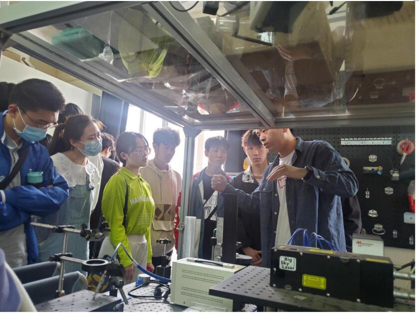 随后同学们来到河南省农业激光技术国际联合实验室,商俊娟老师、博士生张燕燕和硕士生胡一帆、李冬贤、苏睿、李灿、位文涛、李保磊等分别介绍和演示了“表面等离子共振生物传感器”、“激光诱导击穿光谱技术”,“激光表面增强拉曼光谱技术”和“农业面源氮磷污染检测技术及仪器”等实验。