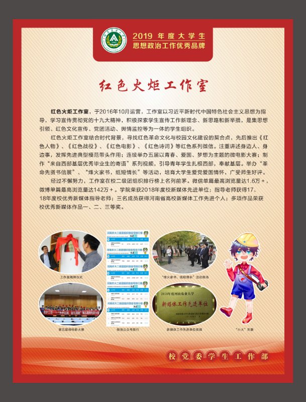 红色火炬工作室将以获得学校2019年度大学生思想教育优秀品牌为契机,不忘初心,在取得已有成绩的基础上,坚持党的领导,坚持正确的政治方向,遵循党和国家的教育方针,从有利于学校内涵发展、大学文化传播和落实立德树人的根本任务出发,弘扬社会主义核心价值观,为我校建设以农为优势特色的高水平大学添砖加瓦!