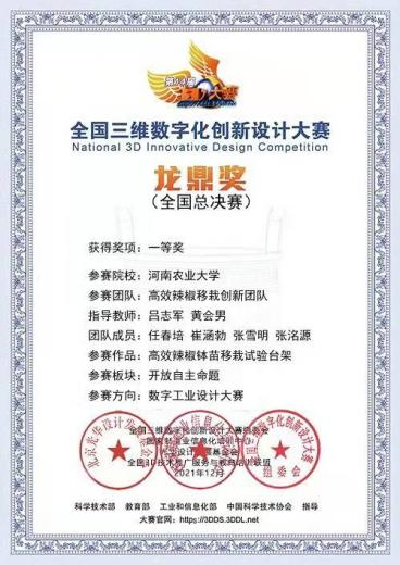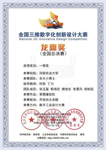 全国第14届三维数字化创新设计大赛年度总决赛于2021年12月4日-5日成功举办。经过激烈角逐,由黄网何勋、丁力老师指导的“农大小勇士”团队(研究生队员:宋玉玺、郭海钦、樊旭东、张景风、胡柏臣)凭借作品《草捆灌装机》取得大赛(数字工业方向)一等奖,由黄网吕志军、黄会男老师指导的“高效辣椒移栽创新团队”(本科生队员:任春培、崔涵勃、张雪明、张洺源)凭借作品《高效辣椒钵苗移栽试验台架》取得大赛(数字工业方向)一等奖,由黄网赵宁、张秀丽老师指导的“Champion A”团队(研究生队员:周湘铭、裴宜坤、陈雪婷、赵任重、宋强龙)凭借作品《高垄作物分层施肥压实机》取得大赛(数字工业方向)二等奖。