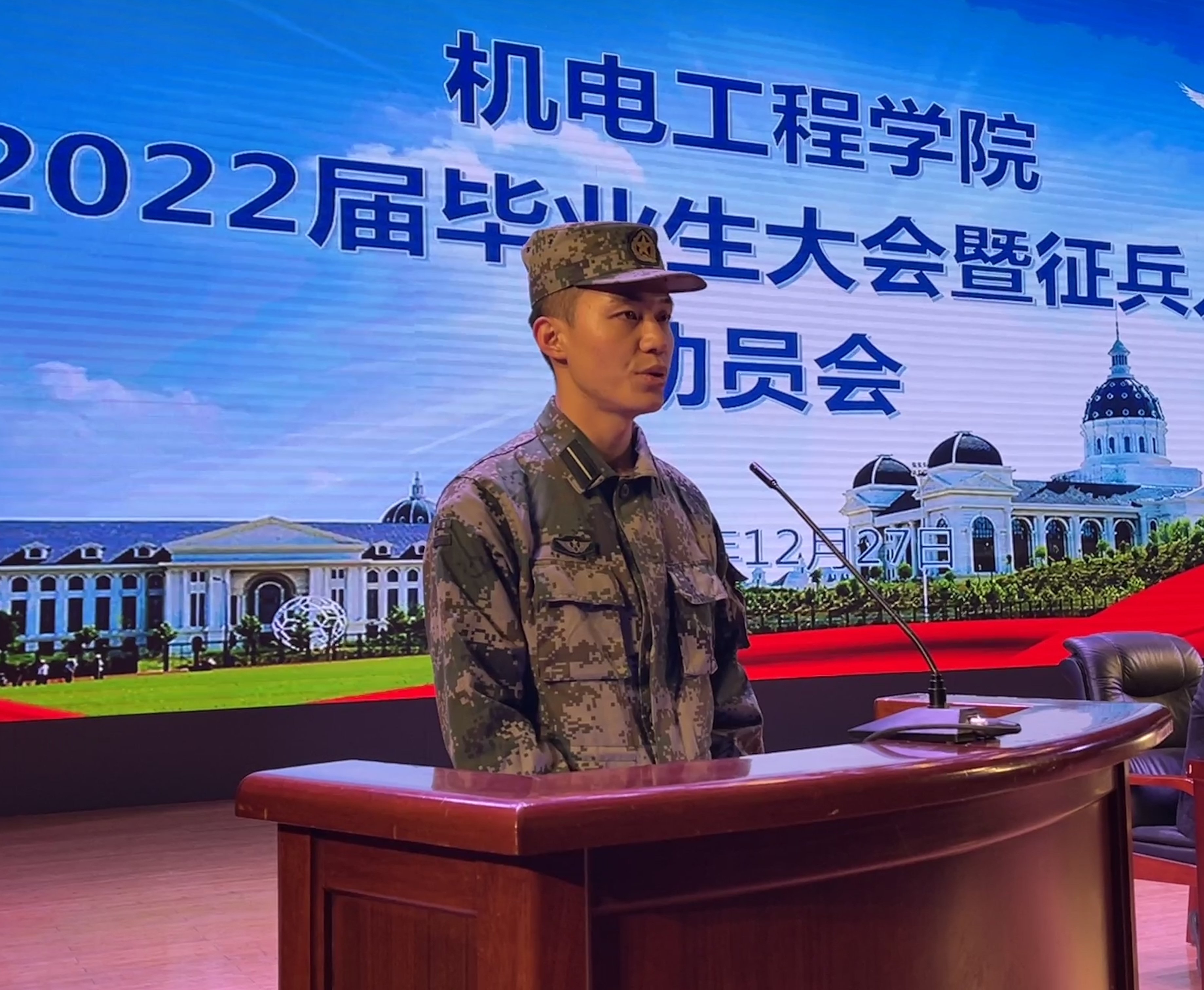 紧接着,黄网退伍大学生代表、19级电信一班的康隆源同学进行发言。他首先对在座的学长学姐表达了美好的祝福,随即结合自身经历讲述了军队生活使他收获了军人的铁血精神和面对困难永不退缩的信念,鼓励大家能够积极投身军营,用奋斗和热血勇担时代使命。