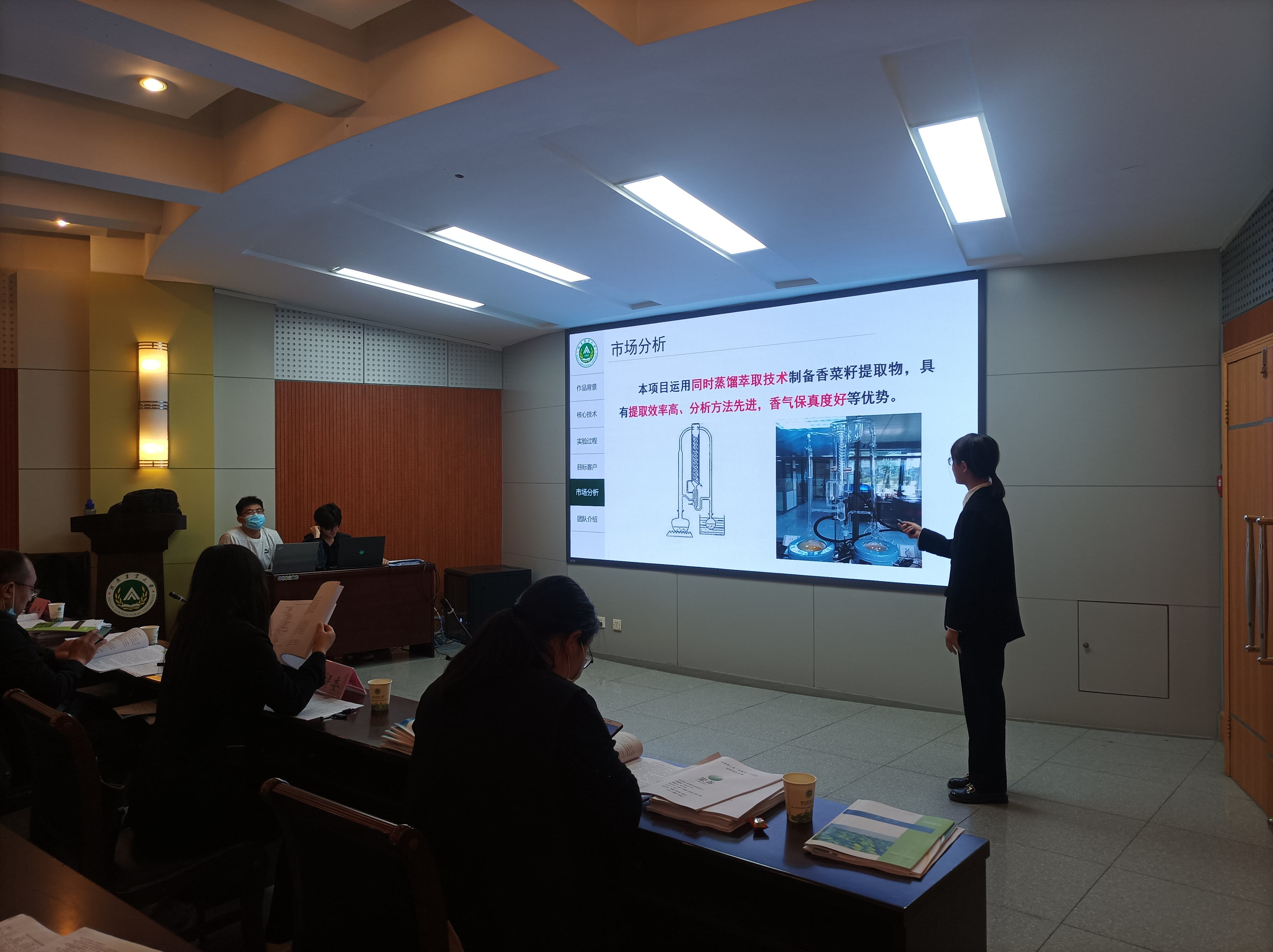 路演开始,首先由主持人详细说明此次路演的规则并宣布路演开始。随后,参与路演的项目负责人,依次通过ppt演示,围绕作品背景、核心技术、实验过程、目标客户、市场分析等多方面内容进行了精彩展示,并进行现场答辩。他们侃侃而谈,自信昂扬,充分展现了我校学子奋发进取、从容不迫的精神风貌与良好形象。最后,评委们根据项目负责人的PPT展示及阅读项目策划书有针对性地提出他们现阶段存在的问题,并就项目内容、创新想法、市场分析等方面提出修改建议。