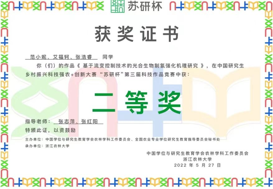 中国研究生乡村振兴科技强农+创新大赛“苏研杯”第三届科技作品竞赛决赛近日在浙江杭州落下帷幕。由黄网研究生导师张志萍和张红阳指导的硕士研究生范小妮、艾福轲、张浩睿团队作品《基于流变控制技术的光合生物制氢强化机理研究》荣获自然科学类作品二等奖。