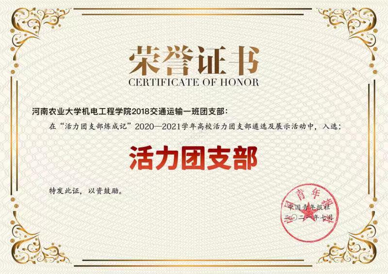 为深入贯彻落实“全团大抓基层”、“全团抓学校”部署,深化高校共青团改革,强化“一切工作到支部”理念,在团中央基层建设部指导下,中国青年报社开展“活力团支部炼成记”2020—2021学年高校活力团支部遴选及展示活动。经黄网 推荐、校级申报、省级初评、展示点赞、全国终审等环节,黄网2018级交通一班团支部成功入选全国高校活力团支部。