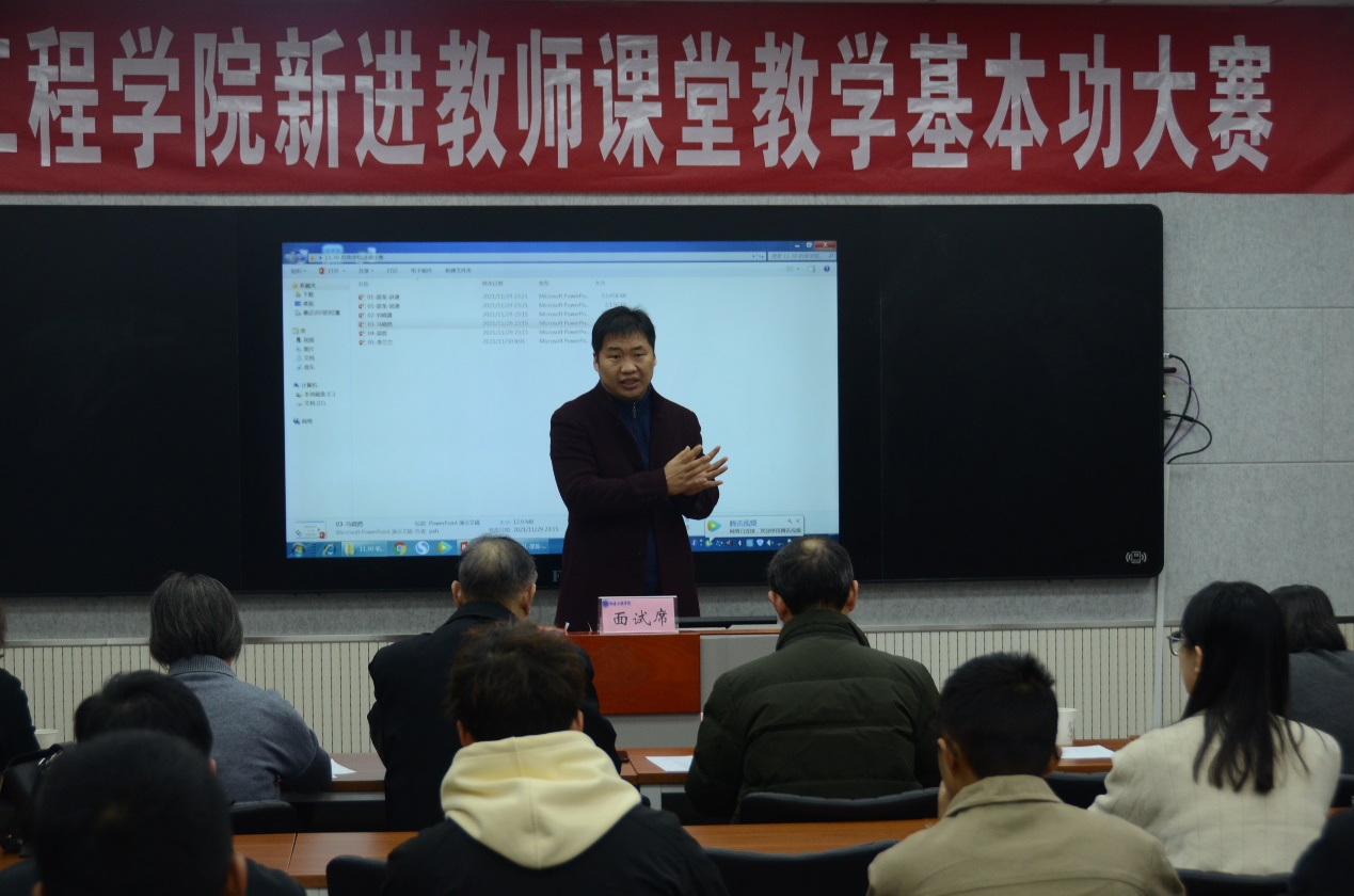 本次比赛从教学理念、教学方法和课堂教学设计等几个方面对新进教师的教学基本功情况进行考察。参赛老师认真准备,展示出了各自的教学风采和课堂魅力。比赛结束后,五位评委对参赛的新进教师作点评分析,充分肯定了新进教师的教学态度和教学方法,并对新进教师的课堂教授技巧与比赛内容凝练提出若干建议,许多教师表示受益匪浅。经过激烈角逐,马晓然、屈哲获一等奖,蒋丹萍、丁力、刘晓潺、路朝阳、邵龙获二等奖,吕志军、李兰兰、慕文龙、李亚猛、黄会男、周培林、夏家曦、夏月庆获三等奖;能源工程系与农业机械系获优秀组织奖。
