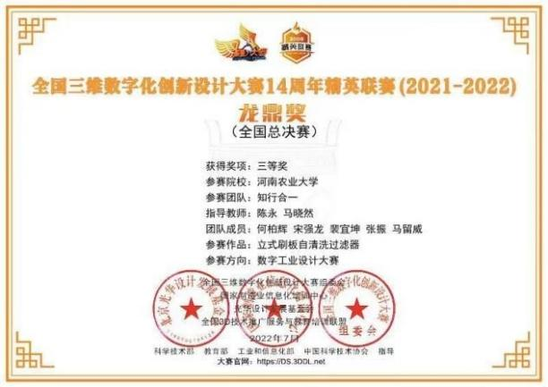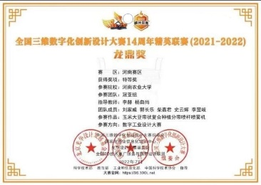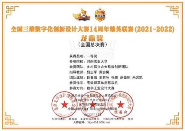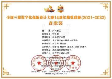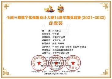 2022年5月23日,全国三维数字化创新设计大赛14周年精英联赛省赛作品评审工作结束,经初评、复评多个环节,最终黄网师生获省特等奖3项的好成绩。由吕志军、黄会男老师指导,任春培、王若冰、赵豪刚、张鹏、朱艺凯本科生组建的“乡村振兴农大移栽创新团队”凭借《高效烟草钵苗移栽机》作品取得省赛特等奖,由陈永、马晓然老师指导,何柏辉、宋强龙、裴宜坤、张振、马留威研究生组建的“知行合一团队”凭借《立式刷板自清洗过滤器》作品取得省赛特等奖,由李赫、杨自尚老师指导,刘家威、郭长乐、柴嘉君、史云辉、李昱岐研究生组建的“冠亚组团队”凭借《玉米大豆带状复合种植分带喷杆喷雾剂》作品取得省赛特等奖。
