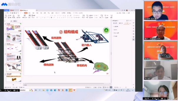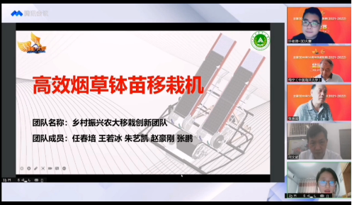结合疫情防控要求,本届全国总决赛采用线上为主的方式进行,经过省赛层层选拔,本次年度总决赛超过400个团队参与角逐国赛龙鼎大奖,为保证大赛公平、公正、有序进行,总决赛所有参赛团队的竞赛顺序均以网络抽签决定。其中,由黄网吕志军、黄会男老师指导,任春培、王若冰、赵豪刚、张鹏、朱艺凯等本科生组建的“乡村振兴农大移栽创新团队”凭借《高效烟草钵苗移栽机》作品取得国赛一等奖;由陈永、马晓然老师指导,何柏辉、宋强龙、裴宜坤、张振、马留威研究生组建的“知行合一团队”凭借《立式刷板自清洗过滤器》作品取得国赛三等奖。