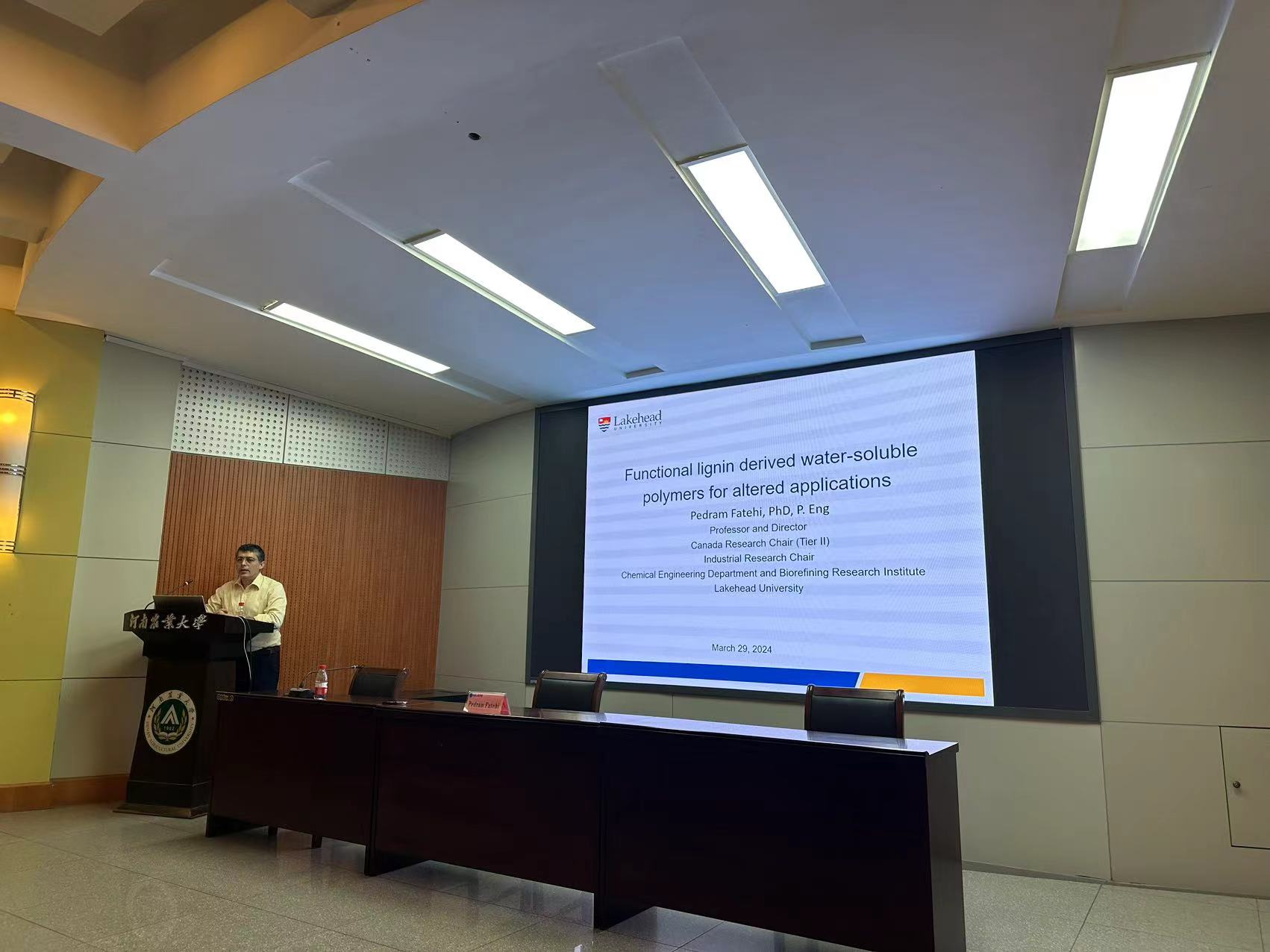 签约仪式结束后,Pedram Fatehi为在座师生作了题为Functional lignin derived water soluble polymers for altered applications(功能性木质素衍生的水溶性聚合物的应用研究)的学术报告,Pedram Fatehi的报告内容丰富、深入浅出,通过幽默风趣的讲授方式吸引了老师和学生的兴趣。在互动环节中,大家都积极提问,Pedram Fatehi与黄网师生进行了热烈的讨论和交流,并就提出的问题进行了耐心地解答,使参与报告会的师生受益颇多。