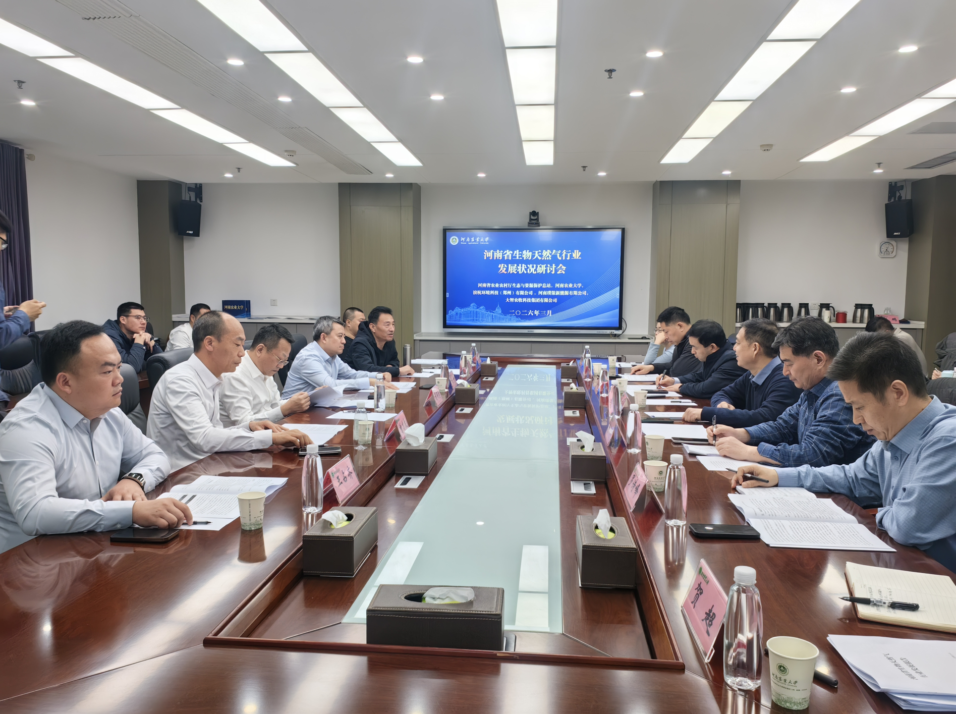 举办的河南省生物天然气行业发展状况研讨会在龙子湖校区召开。河南省农业农村厅生态与资源保护总站副站长罗诗峰,四川巨能天然气股份有限公司董事长兼总经理曾国勇,滨杭环境科技(郑州)有限公司董事长何非,大智农牧科技集团有限公司董事长曾才友,河南璞策新能源有限公司董事长陈墨,农业农村部农村可再生能源新材料与装备重点实验室负责人、河南工程学院副校长焦有宙,黄网