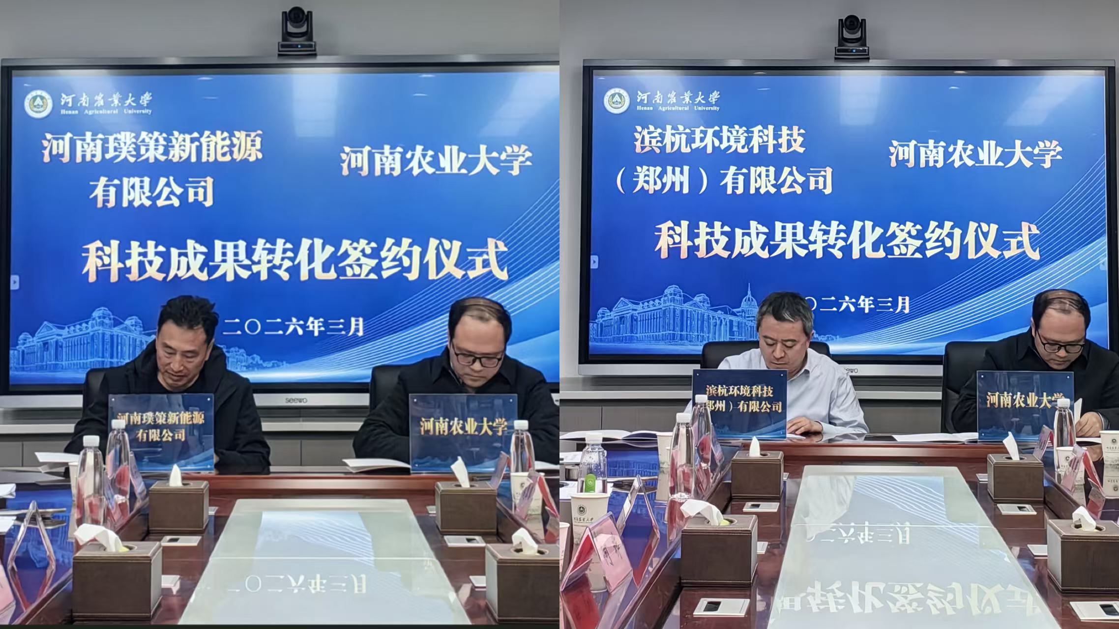 “农林废弃物资源化装备与储能”科研团队代表贺超教授分别与滨杭环境科技(郑州)有限公司代表何非、河南璞策新能源有限公司代表陈墨签订成果转化协议,签约总金额1585万元,内容涵盖有机废弃物制备生物天然气成套技术及装备。