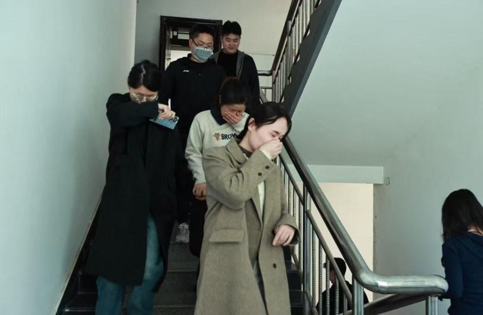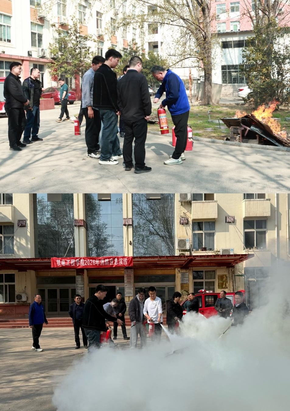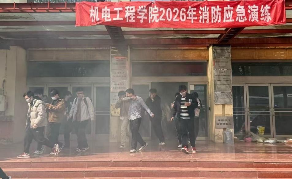 演练警报响起后,楼内模拟浓烟环境,同学们迅速按照逃生要领弯腰捂鼻,沿安全通道有序撤离至指定地点,疏散过程紧张有序。随后工作人员现场教学灭火器 “提、拔、握、压” 使用方法,并组织学生实操练习,同时讲解实验室火灾隐患排查要点。