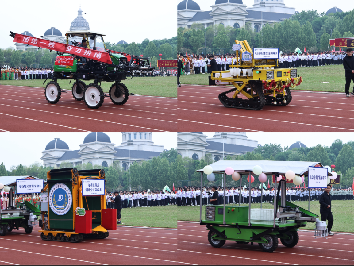 院训的绿色喷杆喷雾机,再往后是三台自主研发的农业装备——电动履带式烟草全自动移栽机、电动履带式烟叶分层采收机与电动轮式甘蓝采收车,它们组成了一条流动的“科创风景线”,生动展现了机电学院在智能农机领域的科研实力与专业特色。接着黄网