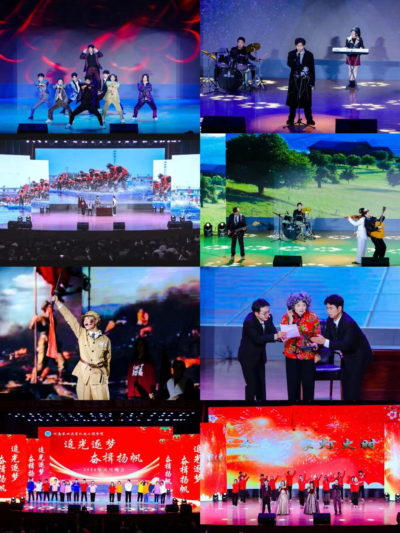 顺颂时祺,秋绥冬禧,本次“追光逐梦,奋楫杨帆”元旦晚会共分为三个篇章,分别为:绽放青春篇、韶华不负篇、星辰大海篇。晚会以热情奔放的舞蹈《奔跑的青春》拉开帷幕,彰显了青春的华彩,谱写了新时代青年的时代篇章,奔涌的农大后浪势不可挡;动人的歌曲联唱《唱响未来》,让我们畅想未来,以明志为灯,以实力为舵,定将平定风浪,闪耀青春的光芒;朗诵《再见2023,你好2024》致敬过去,奔赴未来,鼓励全体师生自我创新,敢于争先,在新时代再建新功;舞蹈串烧《舞动青春》展现出青春应该有锐不可当的激情,广大青年逆风而上,以梦为马,化作一团青春火焰,追随光,成为光,散发光;情景剧《血脉》用真实细腻的表演和引人入胜的情节展现出“血脉”不仅是血管系统,更是为国奉献的炽热之心的传承;舞蹈《教师阵线联盟》,用跳跃的音符、动感的舞姿展现了老师们的青春活力,点亮传承与希翼;小品《天网恢恢》用幽默诙谐的方式来讲述诈骗对我们的危害,提醒农大学子提高警惕,不要轻易相信陌生人,以免上当受骗;此外,乐队弹唱《夜空中最亮的星》、小提琴演奏《告白之夜》、歌伴舞表演《相亲相爱》,都受到全场观众的热烈反响,现场气氛高涨。最后,学院领导老师上台送上元旦祝福,为全院师生送上最诚挚的节日祝福,使整场晚会的气氛推向高潮!