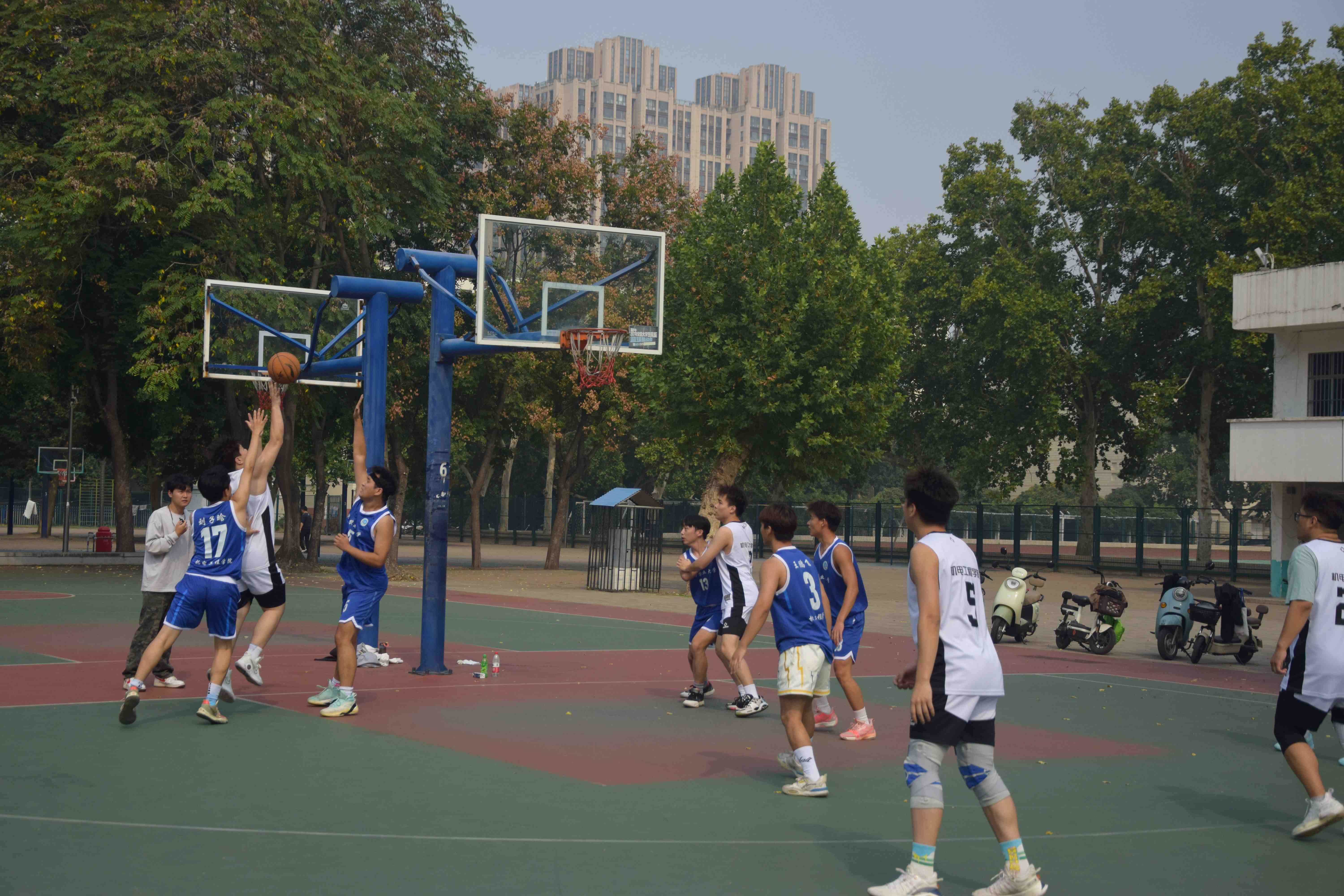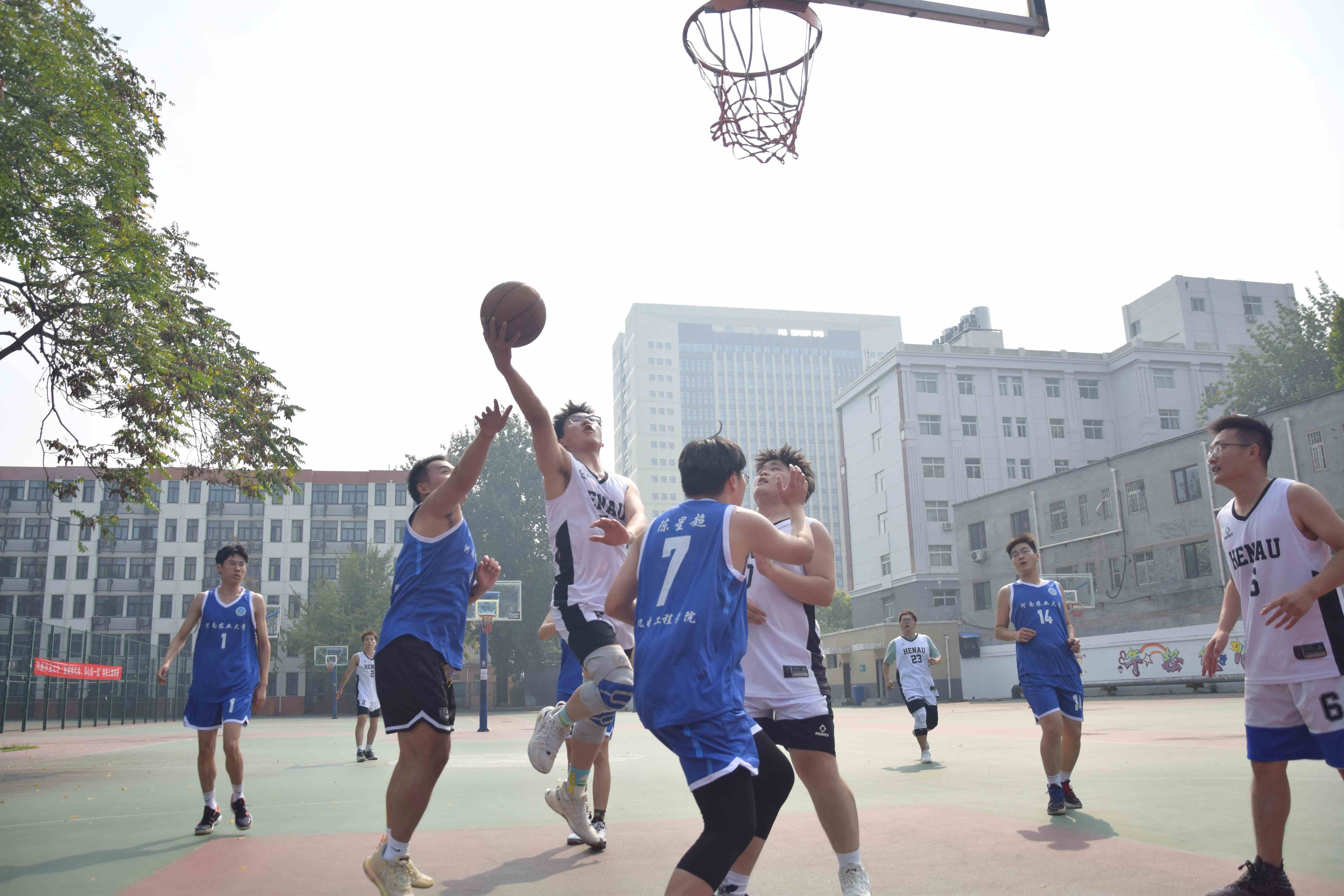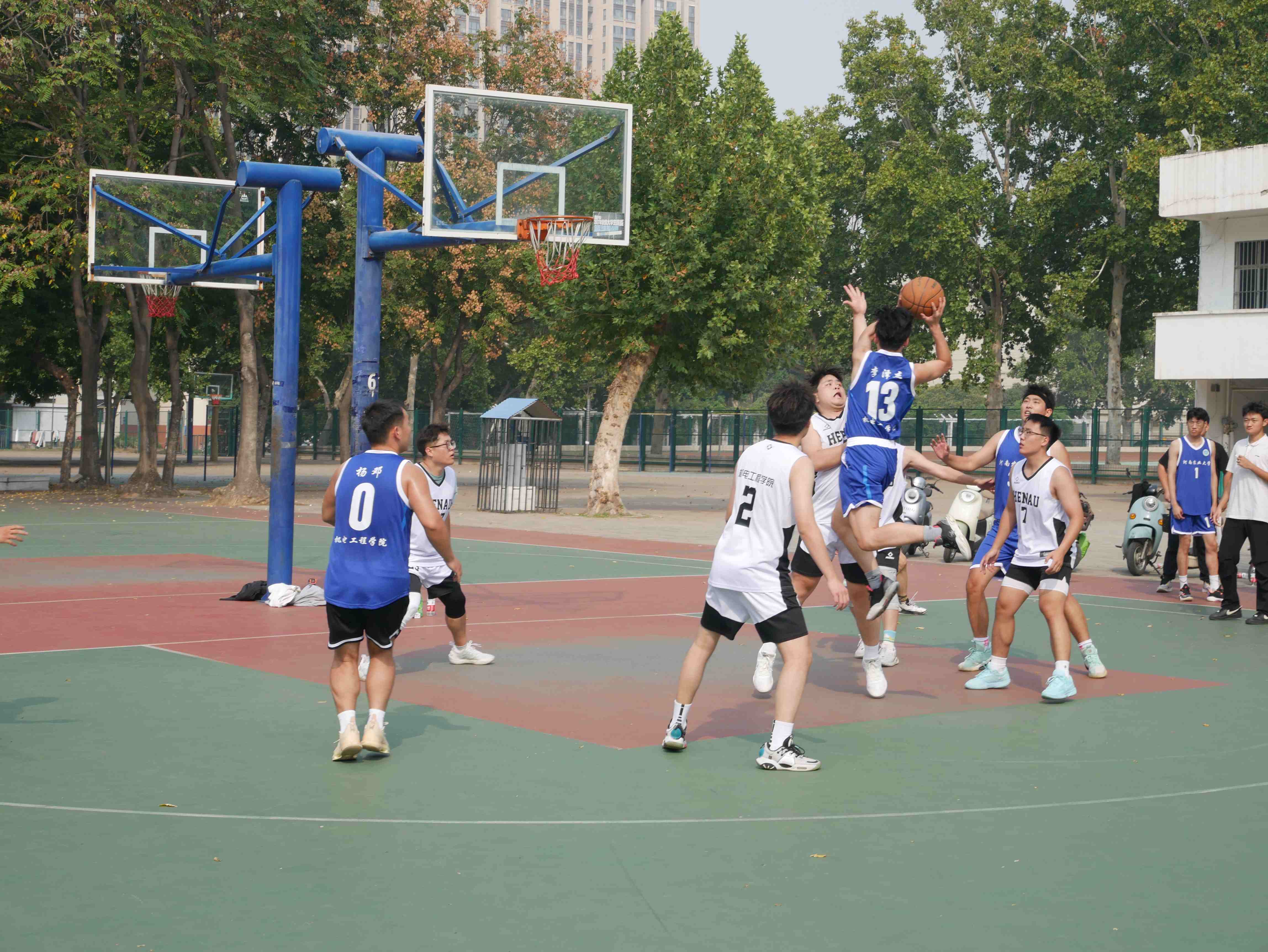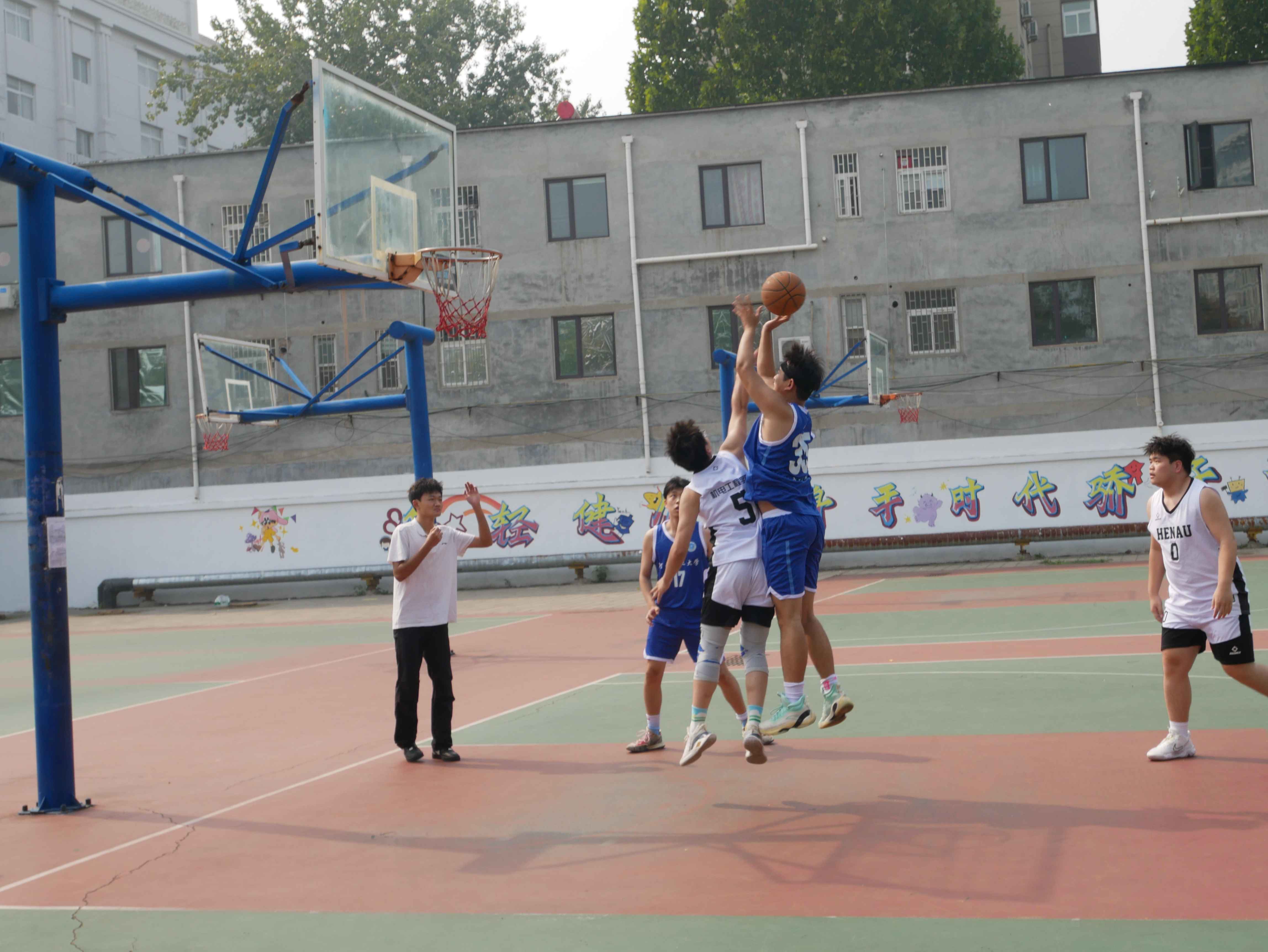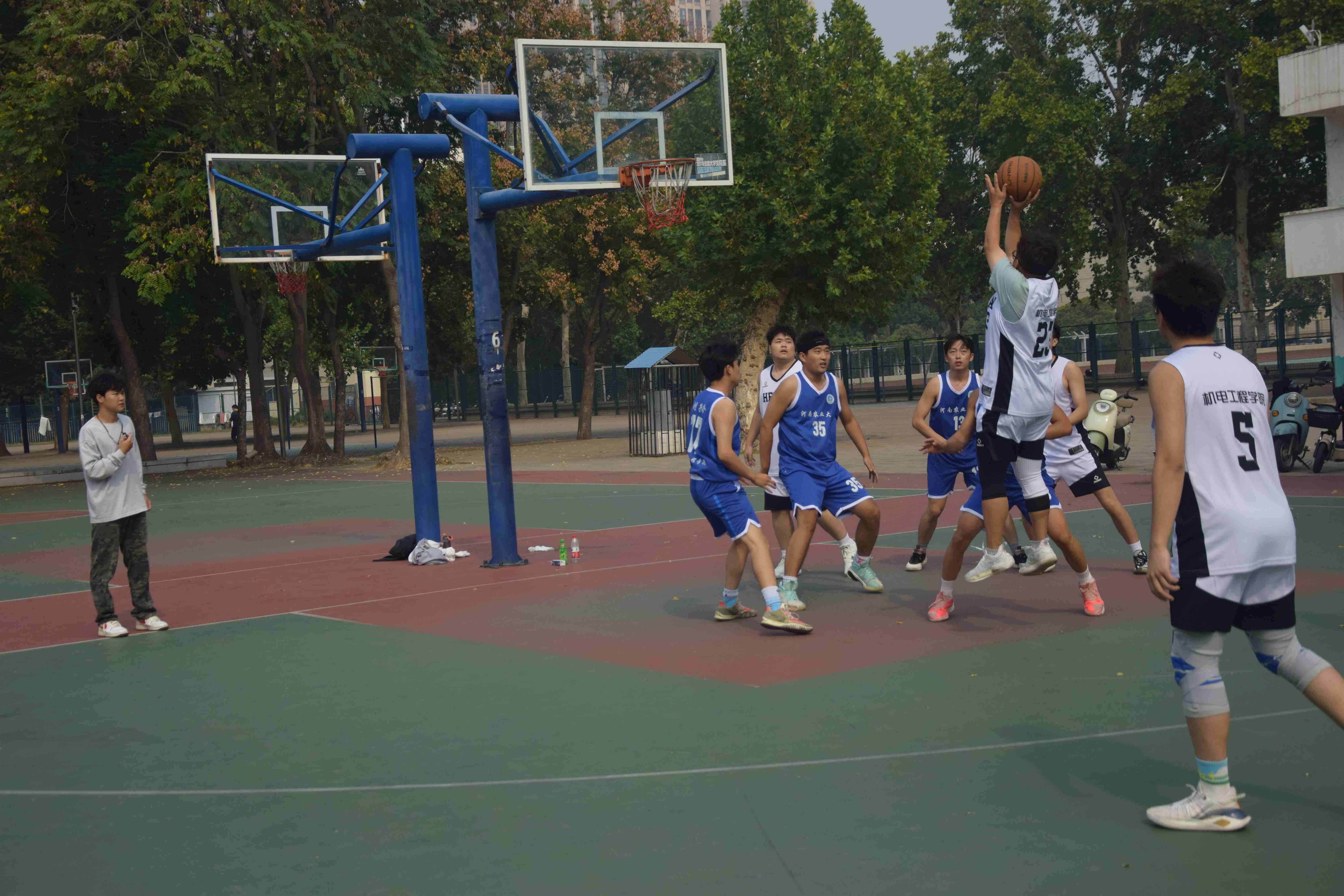“以体育人 强智健体” 学生体育竞赛系列活动实施方案》文件精神,丰富研究生课余生活、展现研究生进取向上的风貌,10月9日至16日,由院党委主办、院研会承办的“跃动青春,迎篮而上,机电新力量,赛场展辉煌”研究生新生篮球赛在文化路校区西篮球场举行。本次比赛共研究生三个年级、本科生和教职工篮球队共5支队伍参加。比赛期间院党委副书记宋晶,院教工篮球队队长丁攀、研究生辅导员李锦到场观看比赛,为挥汗如雨的参赛人员加油鼓气。