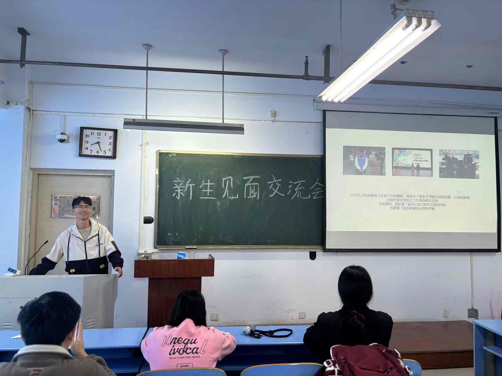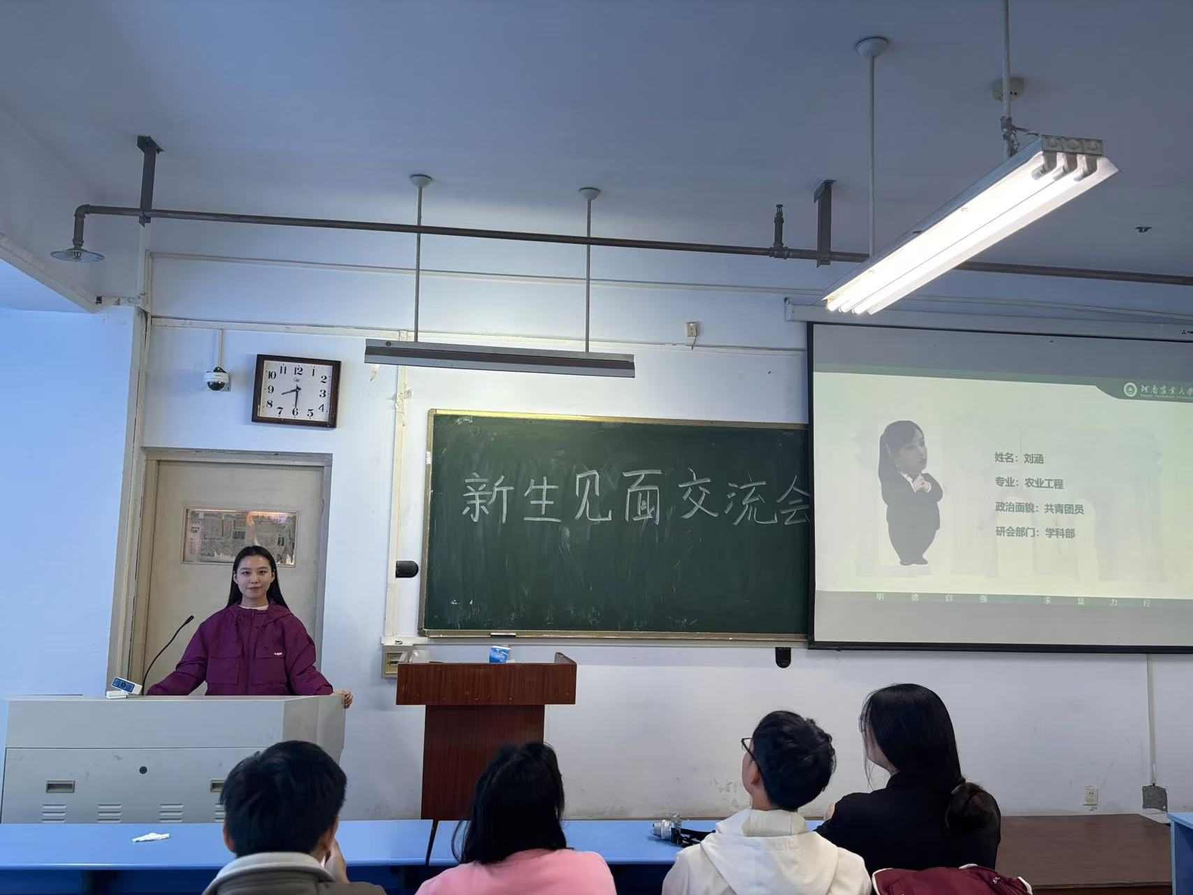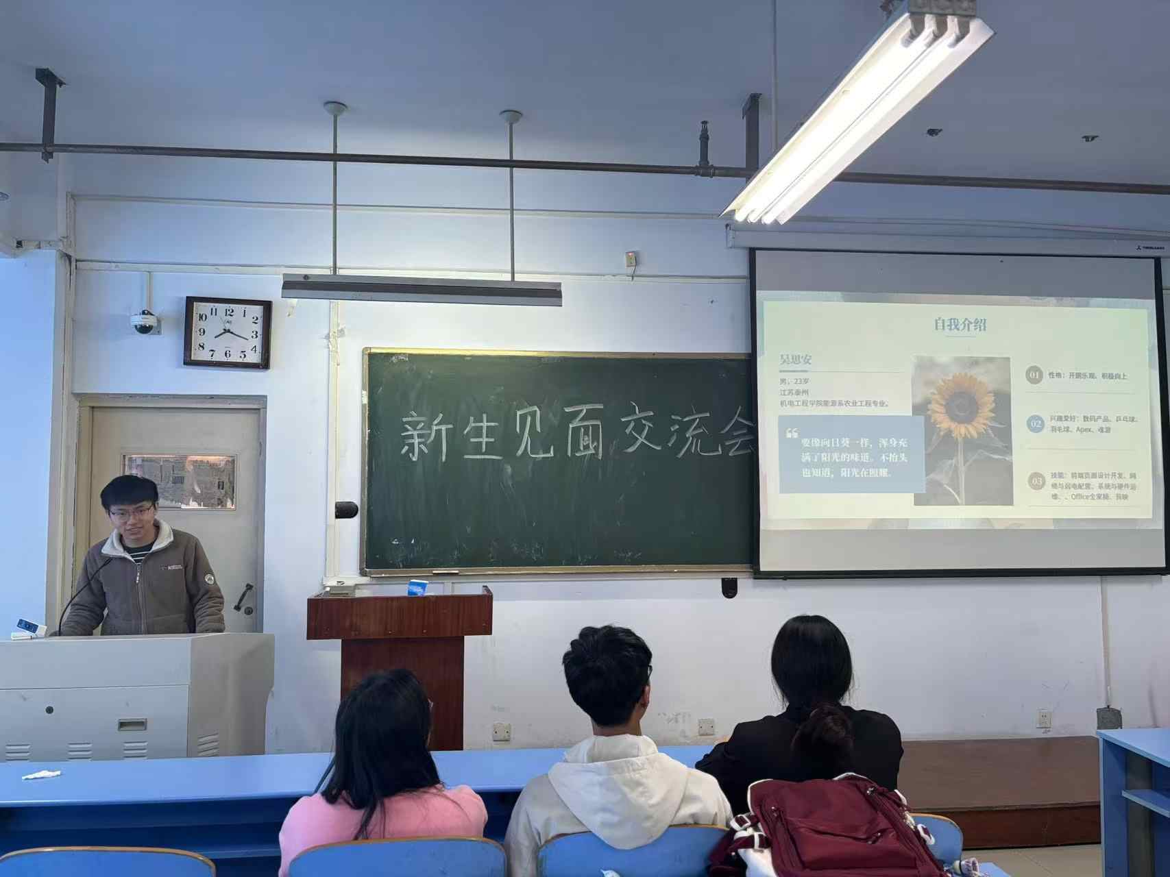 随后同学们依次上台,从个人基本情况,学习科研方向,个人兴趣爱好与特长等几方面分别进行自我介绍。