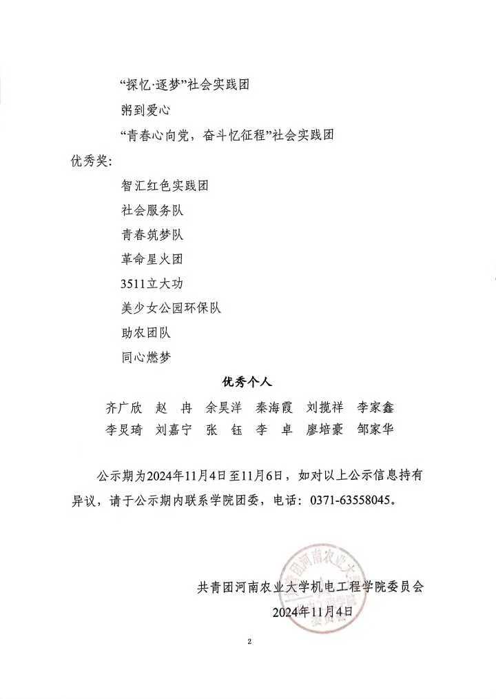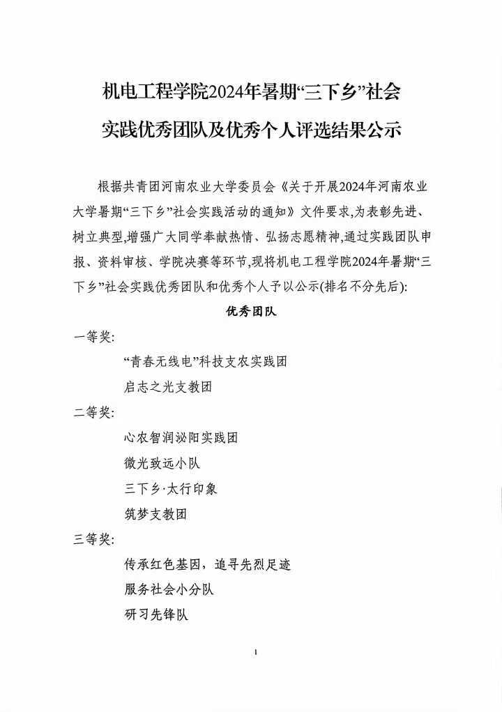 根据共青团黄网 委员会《关于开展2024年黄网 暑期“三下乡”社会实践活动的通知》文件要求,为表彰先进、树立典型,增强广大同学奉献热情、弘扬志愿精神,通过实践团队申报、资料审核、学院决赛等环节,现将黄网 2024年暑期“三下乡”社会实践优秀团队和优秀个人予以公示(排名不分先后):