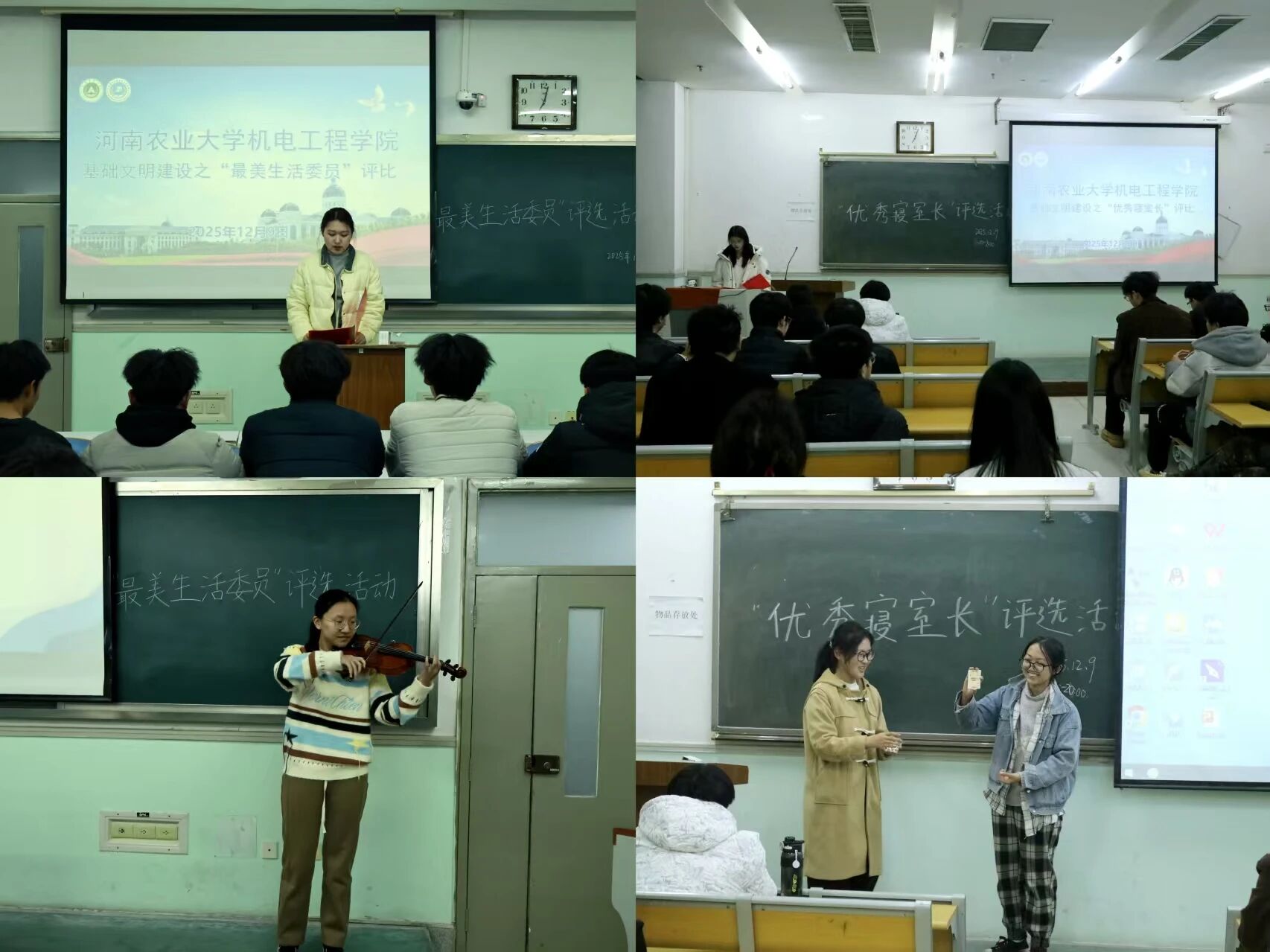 活动开始后,参赛同学依次登台,以PPT展示拉开个人风采秀的序幕:好室友们分享互帮互助的同窗情谊、共研学业的奋斗点滴,用包容与真诚筑牢寝室“小家”;寝室长们细数以身作则的担当时刻、统筹协调的管理心得,用责任与担当搭建沟通桥梁;生活委员们讲述心系同学的服务故事、默默奉献的日常点滴,用细致与热忱温暖集体生活。每一份PPT展示结束后,才艺表演无缝衔接,为现场带来连连惊喜:悠扬的小提琴声婉转流淌,将青春情愫娓娓道来;动听的歌曲演唱饱含深情,传递对生活的热爱。参赛同学以“风采+才艺”的双重展示,尽显机电学子全面发展的青春风貌。