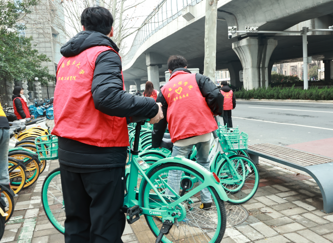 活动中,志愿者们迅速集结、分工协作,聚焦文化路校区北门人流密集、车辆停放杂乱的重点区域,对无序堆放、占道倒放的共享单车展开集中规整。大家默契协作,逐一扶正倒地车辆,耐心将错位、占道单车搬运至指定停放区域,认真对齐车身、规范摆放,让原本杂乱的停车区域焕然一新,通行道路更加顺畅。同时,志愿者主动向骑、停单车的同学宣传文明停放理念,引导大家自觉规范停车、爱护公共环境,让“文明共享、方便你我”的意识深入人心,文明的涟漪在校园不断扩散。