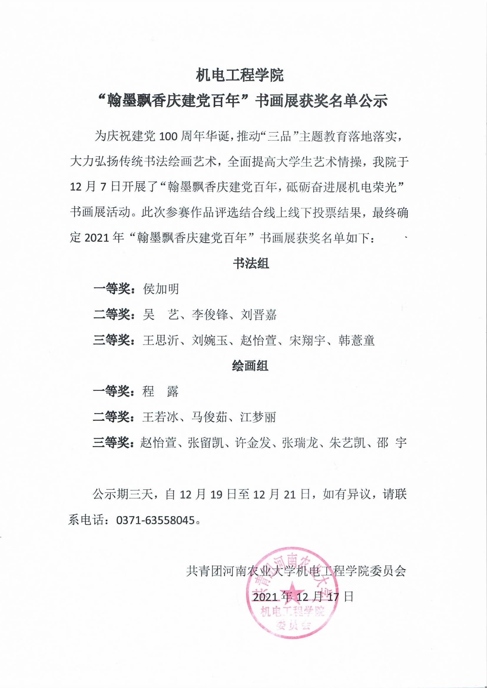 为庆祝建党100周年华诞,推动“三品”主题教育落地落实,大力弘扬传统书法绘画艺术,全面提高大学生艺术情操,黄网于12月7日开展了“翰墨飘香庆建党百年,砥砺奋进展机电荣光”书画展活动。此次参赛作品评选结合线上线下投票结果,最终确定2021年“翰墨飘香庆建党百年”书画展获奖名单如下: