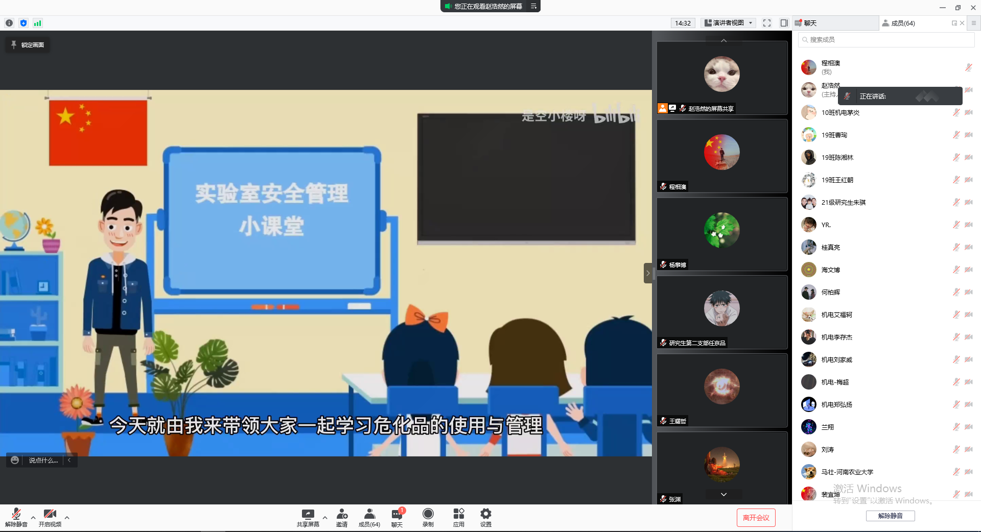 高校实验室火灾、爆炸、投毒、中毒、危险品丢失等实验室安全事故时有发生,严重威胁着实验老师和同学们的生命安全。为了在学生心中形成“安全第一”的实验室氛围,使广大学生了解更多的实验安全常识,提高安全防范意识,真正将实验安全知识运用到实验生活中,真正落实“安全上心,实验顺心”的方针,保证学生在实验中的安全,进一步加强实验室安全管理工作,3月10日黄网21级研究生开展了实验室安全培训工作线上会议。
