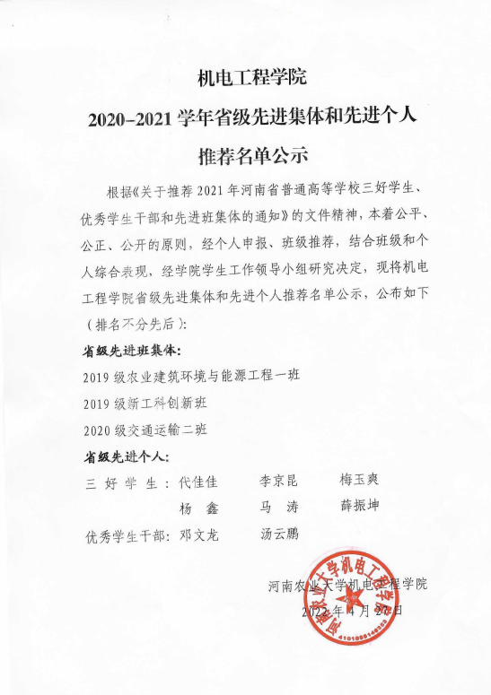 根据《关于推荐2021年河南省普通高等学校三好学生、优秀学生干部和先进班集体的通知》的文件精神,本着公平、公正、公开的原则,经个人申报、班级推荐,结合班级和个人综合表现,经黄网 学生工作领导小组研究决定,现将黄网 省级先进集体和先进个人推荐名单公示,公布如下(排序不分先后):