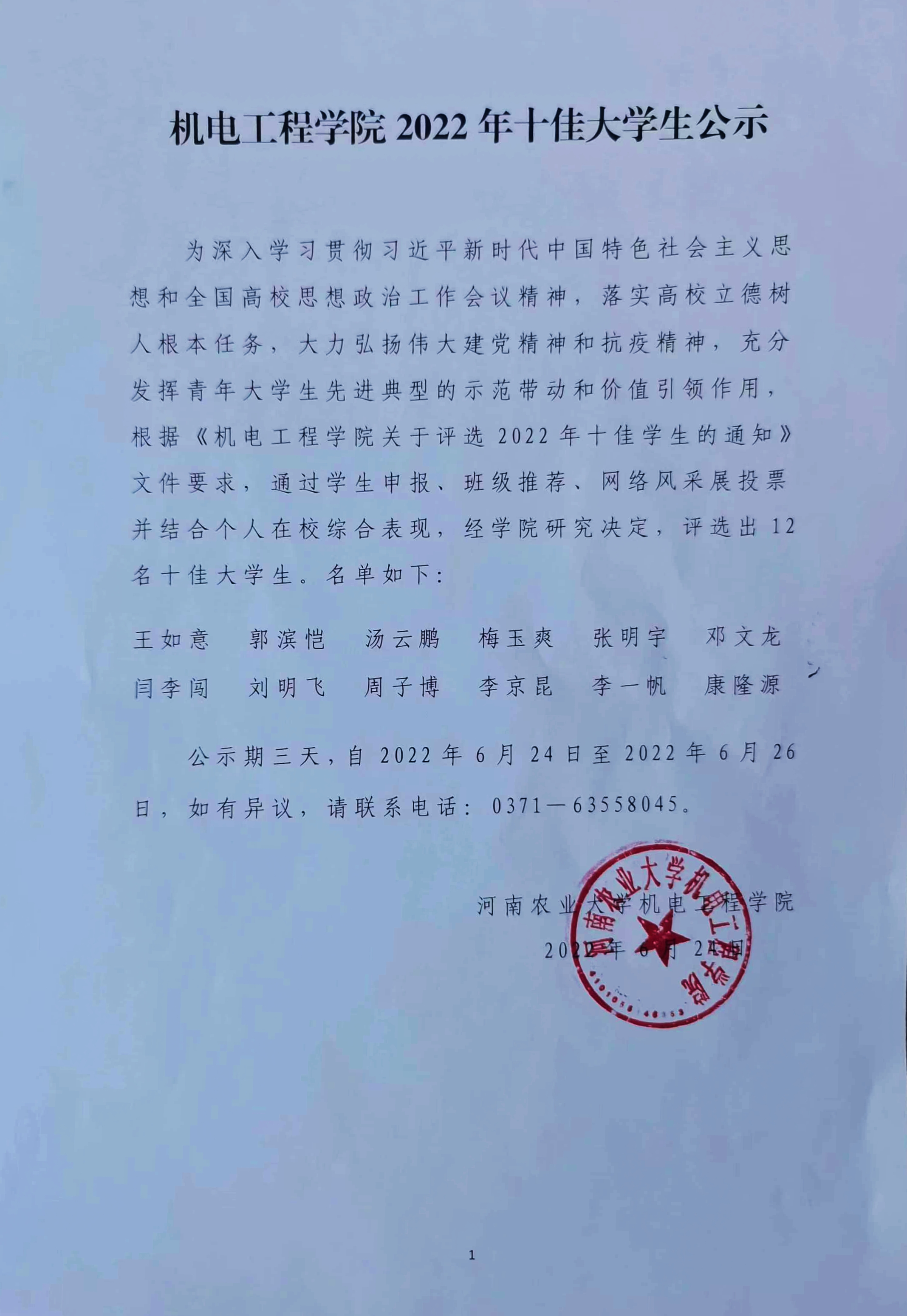 为深入学习贯彻习近平新时代中国特色社会主义思想和全国高校思想政治工作会议精神,落实高校立德树人根本任务,大力弘扬伟大建党精神和抗疫精神,充分发挥青年大学生先进典型的示范带动和价值引领作用,根据《黄网 关于评选2022年十佳学生的通知》文件要求,通过学生申报、班级推荐、网络风采展投票并结合个人在校综合表现,经黄网 研究决定,评选出12名十佳大学生。名单如下: