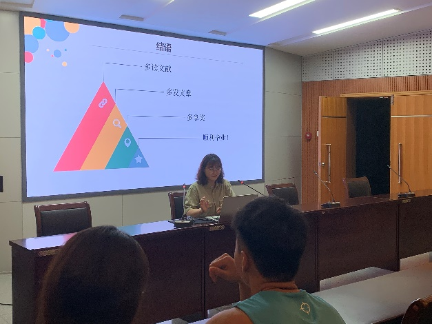 座谈会上,优秀硕士毕业生代表岳田以科研学习为切入点,结合自身的实际经历,向大家分享了文献阅读的有效方法、做实验的技巧以及论文发表的六大要素,同时也提醒研究生们要做到合理规划时间,让科研更加高效。李冬贤介绍了进修博士的三种常见途径:硕博连读、申请考核和统考,结合自身实际,针对申请考核展开了讲述,告诫大家要“早研究、出成果、准备足”,同时也毫不吝啬地向大家分享了联系导师的小技巧,让大家受益匪浅。