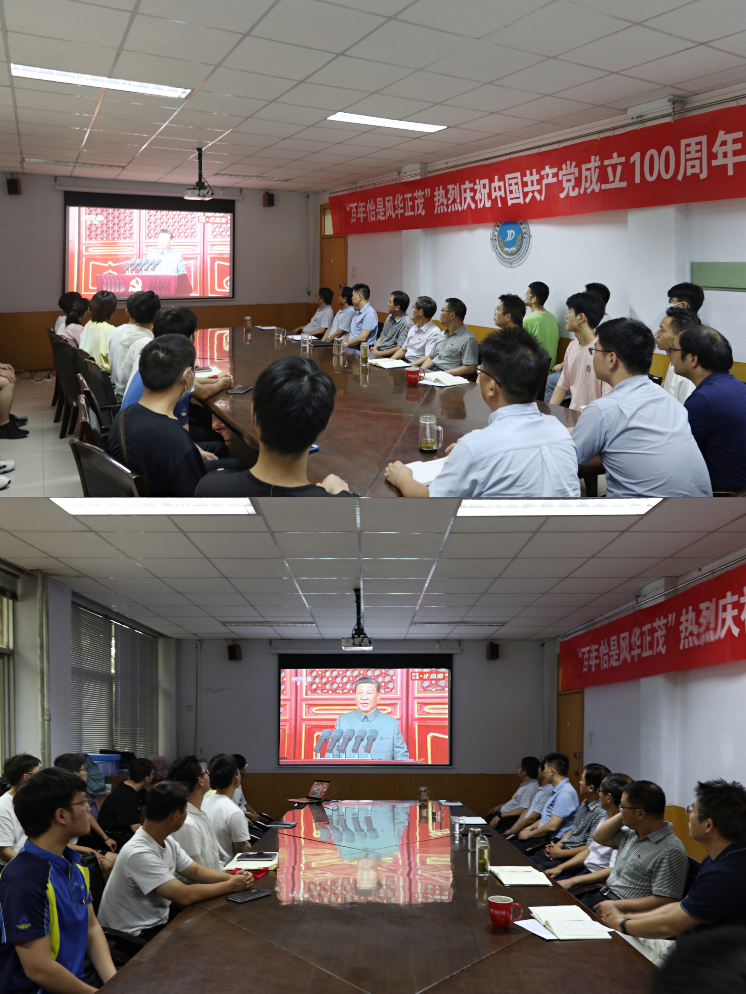 二楼会议室、报告厅集中观看,各教工支部分别集中观看。