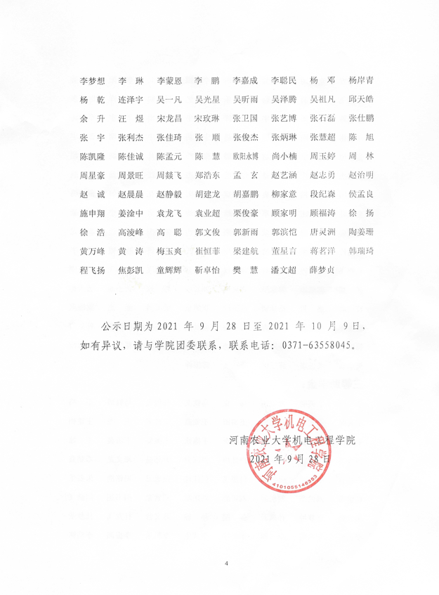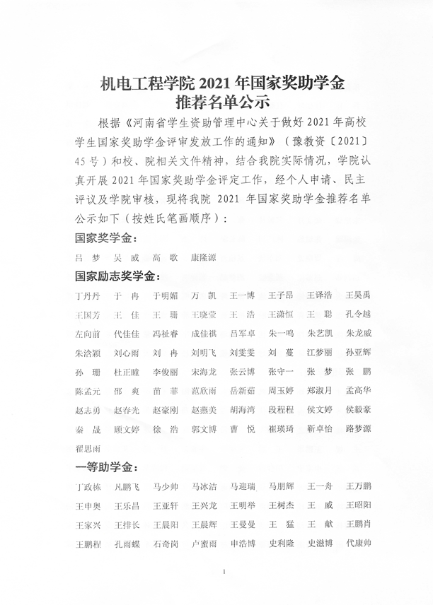 根据《河南省学生资助管理中心关于做好2021年高校学生国家奖助学金评审发放工作的通知》(豫教资[2021]45号)和校、院相关文件精神,结合黄网实际情况,黄网 认真开展2021年国家奖助学金评定工作,经个人申请、民主评议及黄网 审核,现将黄网2021年国家奖助学金推荐名单公示如下(按姓氏笔画顺序)