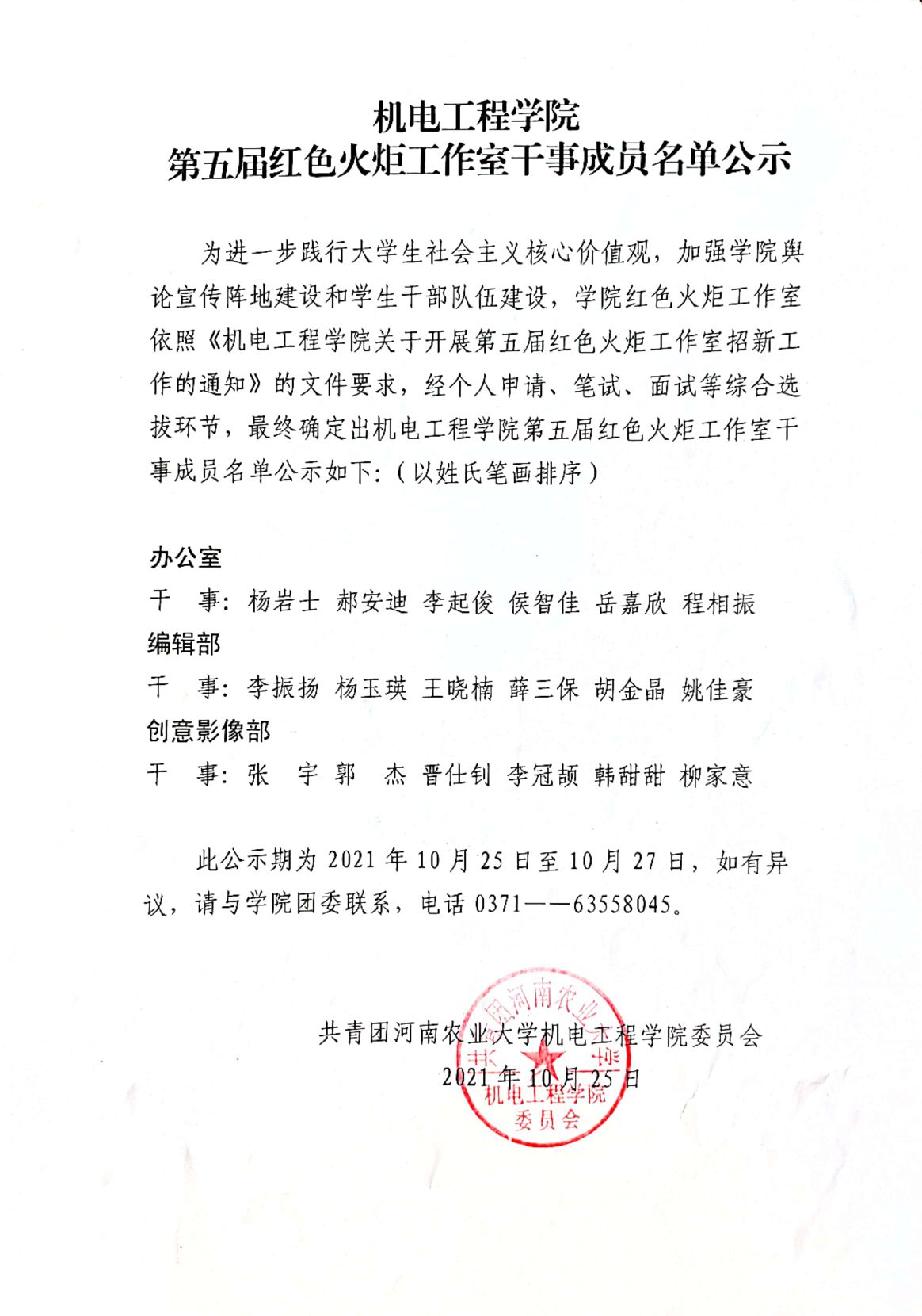 为进一步践行大学生社会主义核心价值观,加强黄网 舆论宣传阵地建设和学生干部队伍建设,黄网 红色火炬工作室依照《黄网 关于开展第五届红色火炬工作室招新工作的通知》的文件要求,经个人申请、笔试、面试等综合选拔环节,最终确定出黄网 第五届红色火炬工作室干事成员名单公示如下:(以姓氏笔画排序)