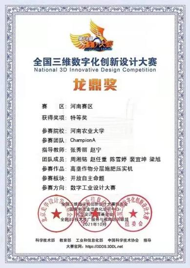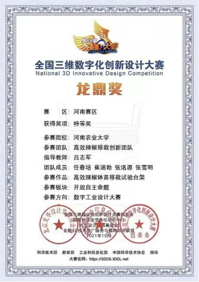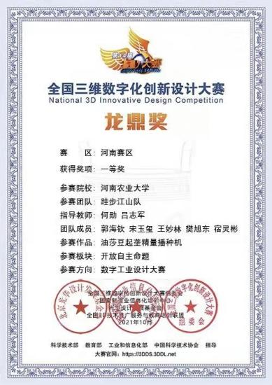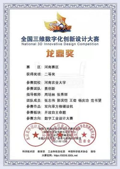 2021年第14届全国三维数字化创新设计大赛自3月25日启动以来,全国31个省/直辖市/自治区赛区,大学生组共有650所高校、1296个院系报名参赛;各赛区、各院校参赛报名团队共15830个,提交作品共12149件。2021年10月23日-24日河南赛区竞赛于河南理工大学成功举办,各参赛团队经大赛抽签、线上作品讲解及专家问辩等环节,最终黄网师生获省特等奖3项、省一等奖1项、省二等奖2项的好成绩。