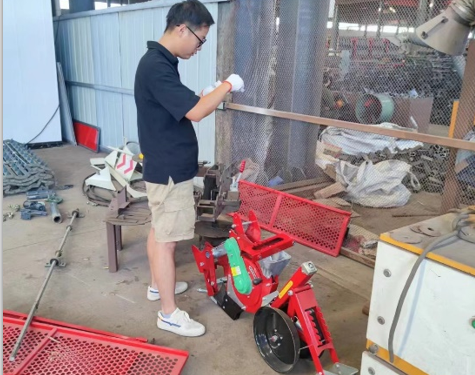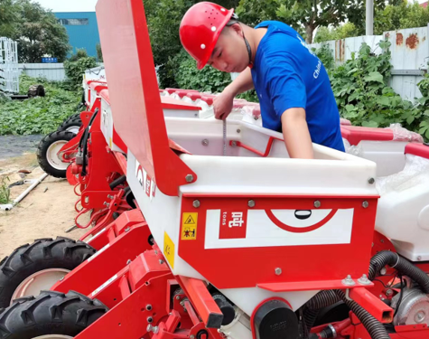 7月13日下午,桂真亮正在企业车间外为播种试验做好机器调试工作
