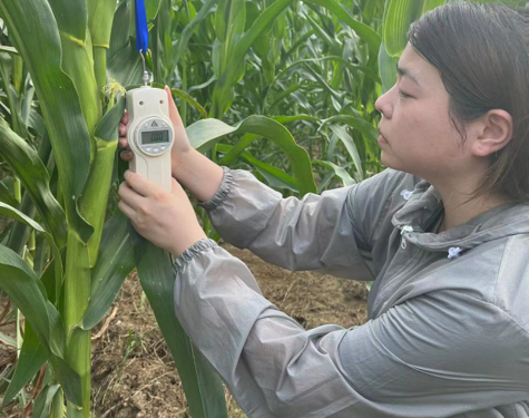 8月4日上午,陈博正在玉米试验田里测量玉米植株生长特性