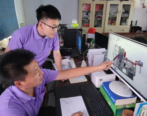 8月13日上午,陈劲帆正在与企业研发工程师讨论三维图如何改进