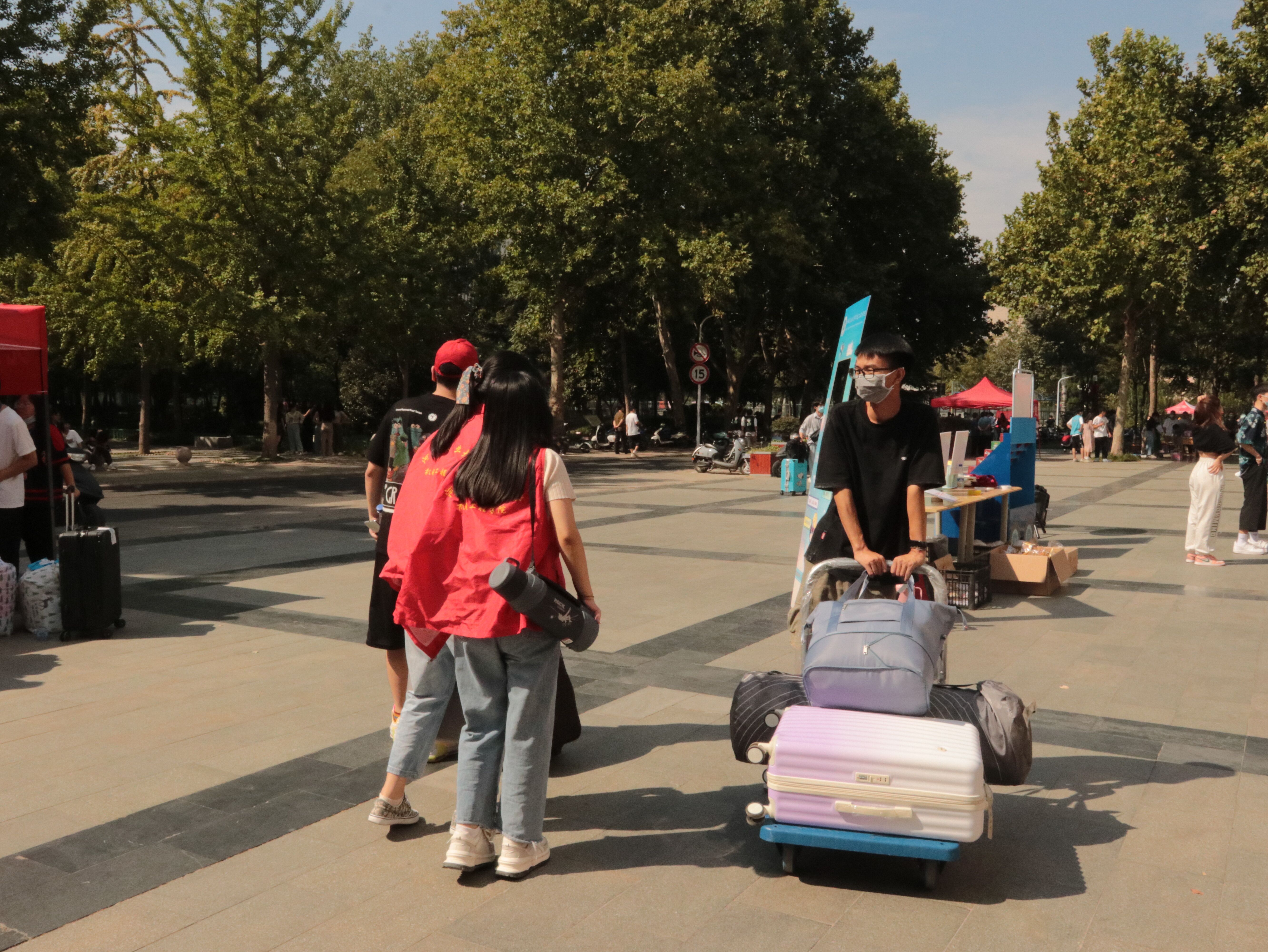 标识、显眼的红色帐篷、暖心的横幅标语为新生搭建起了入学报到的第一站。伴随着新生的陆续到来,学生工作人员耐心引导新生逐步完成入校报到工作,从检查报到所需材料到提醒新生参加核酸检测,为新生在各个环节里保驾护航、指引方向,确保学生顺利报到;学生志愿者积极提供热心服务,深入迎新志愿服务一线,热情帮助新生将行李搬运至所在宿舍,使得新生报到更加便捷和高效。