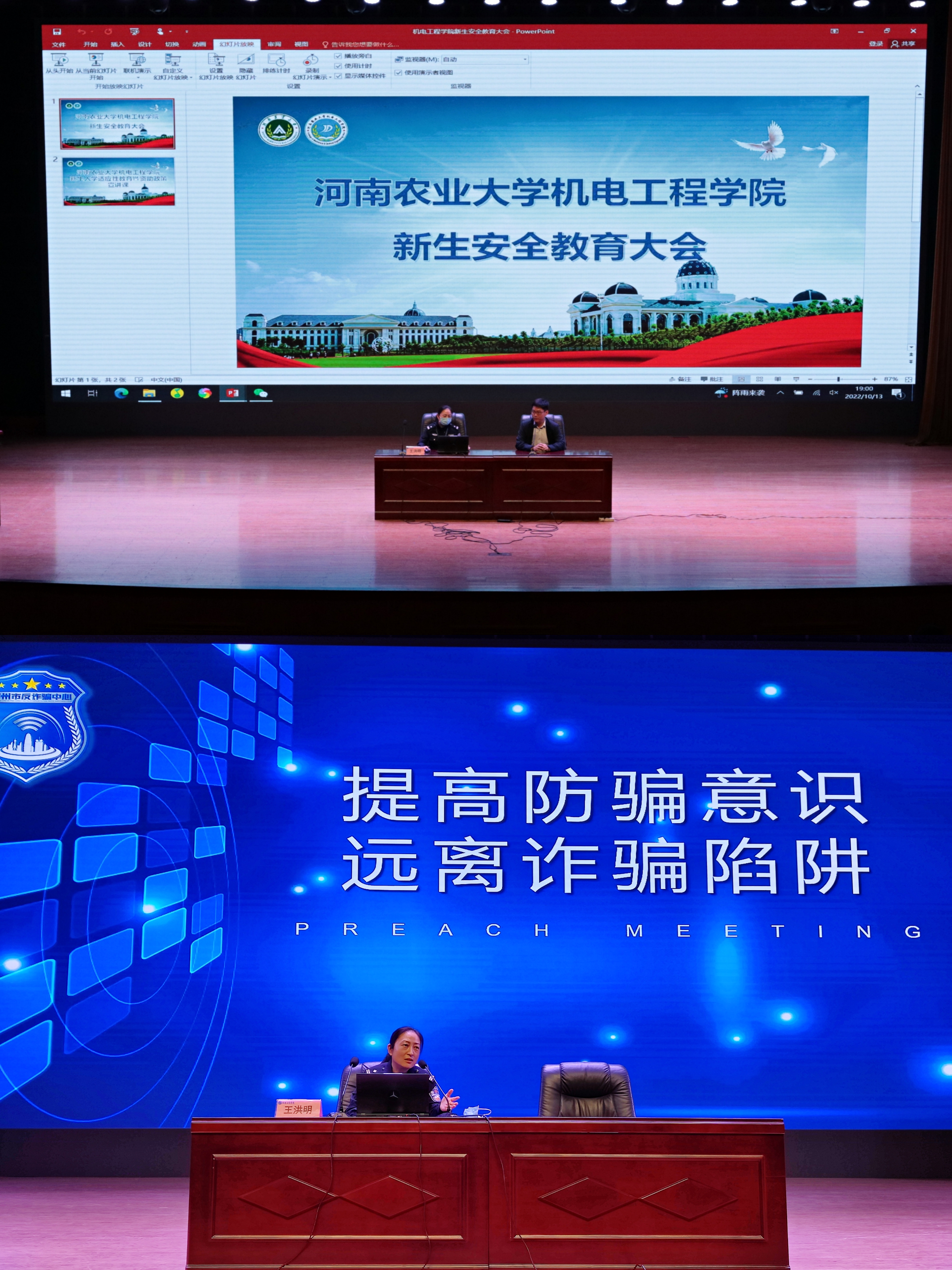 为进一步做好学生安全教育工作,加强同学们对电信网络诈骗的识别和应对能力,10月13日晚,黄网于文化路校区千人大礼堂举行2022级新生安全教育大会,郑州市公安局金水区分局警官王洪明,黄网党委副书记宋晶、团委书记黄笑、年级辅导员胡亭亭出席此次大会,2022级全体新生参加大会。