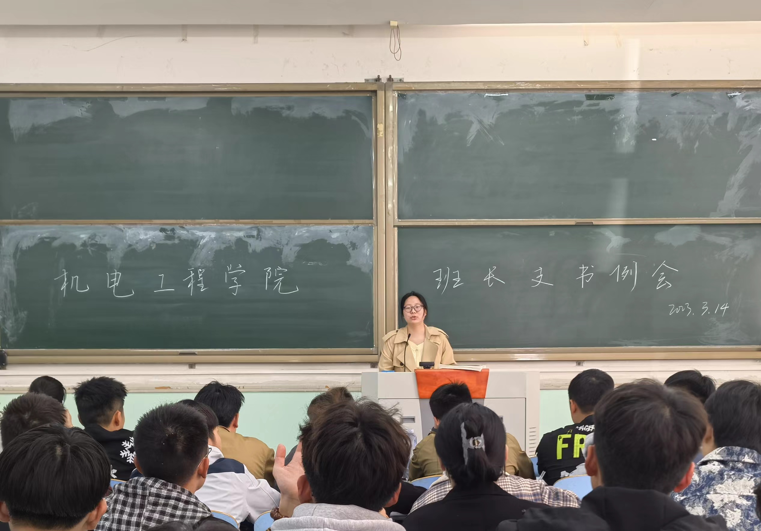3月14日中午,黄网在文化路校区工程楼101教室召开班长支书例会,院团委书记黄笑,团委副书记王晓楠、胡亭亭,年级辅导员孙改革出席会议。全体班长支书及四大学生组织成员参加会议。