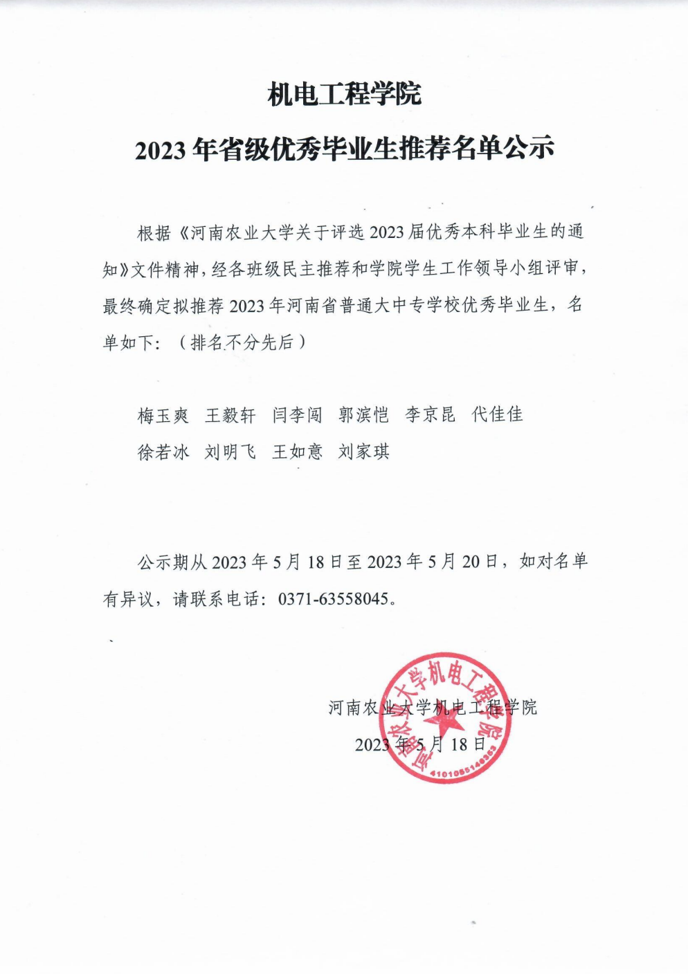 根据《黄网 关于评选 2023 届优秀本科毕业生的通知》文件精神,经各班级民主推荐和黄网 学生工作领导小组评审最终确定拟推荐 2023 年河南省普通大中专学校优秀毕业生,名单如下:(排名不分先后 )