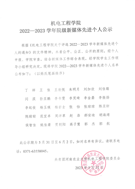根据《黄网 关于评选2022—2023学年新媒体先进个人的通知》的文件精神,本着公平、公正、公开的原则,经个人申报、黄网 审查,结合新媒体工作综合表现,经黄网 学生工作领导小组研究决定,现将黄网 2022—2023学年新媒体先进个人名单公布如下:(以姓氏笔画排序)
