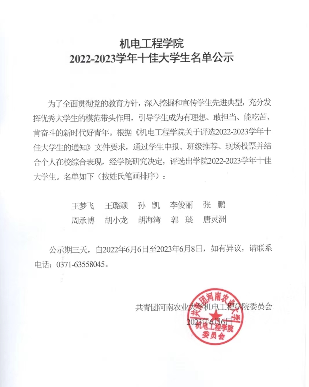 黄网 2022-2023学年十佳大学生名单公示