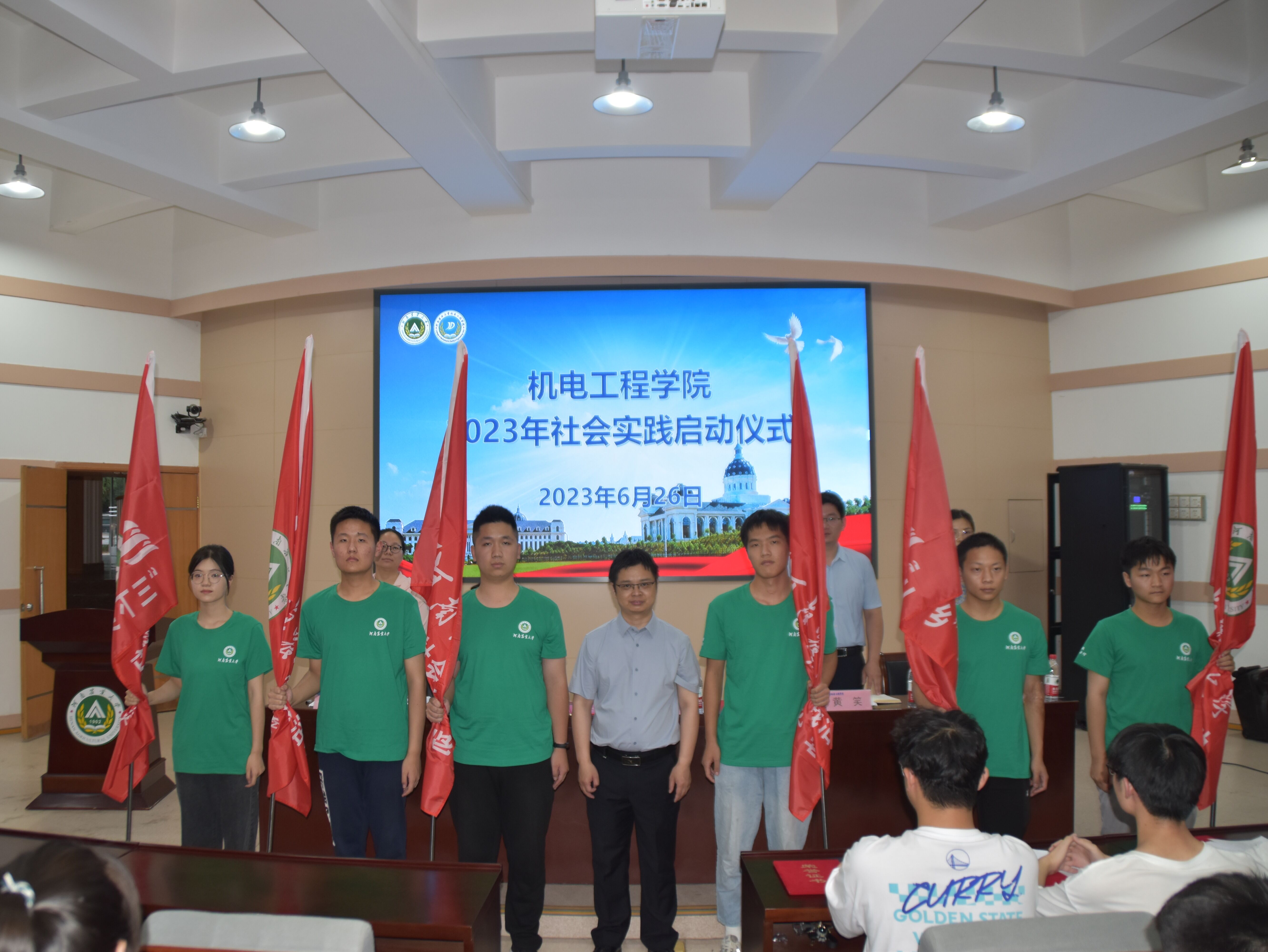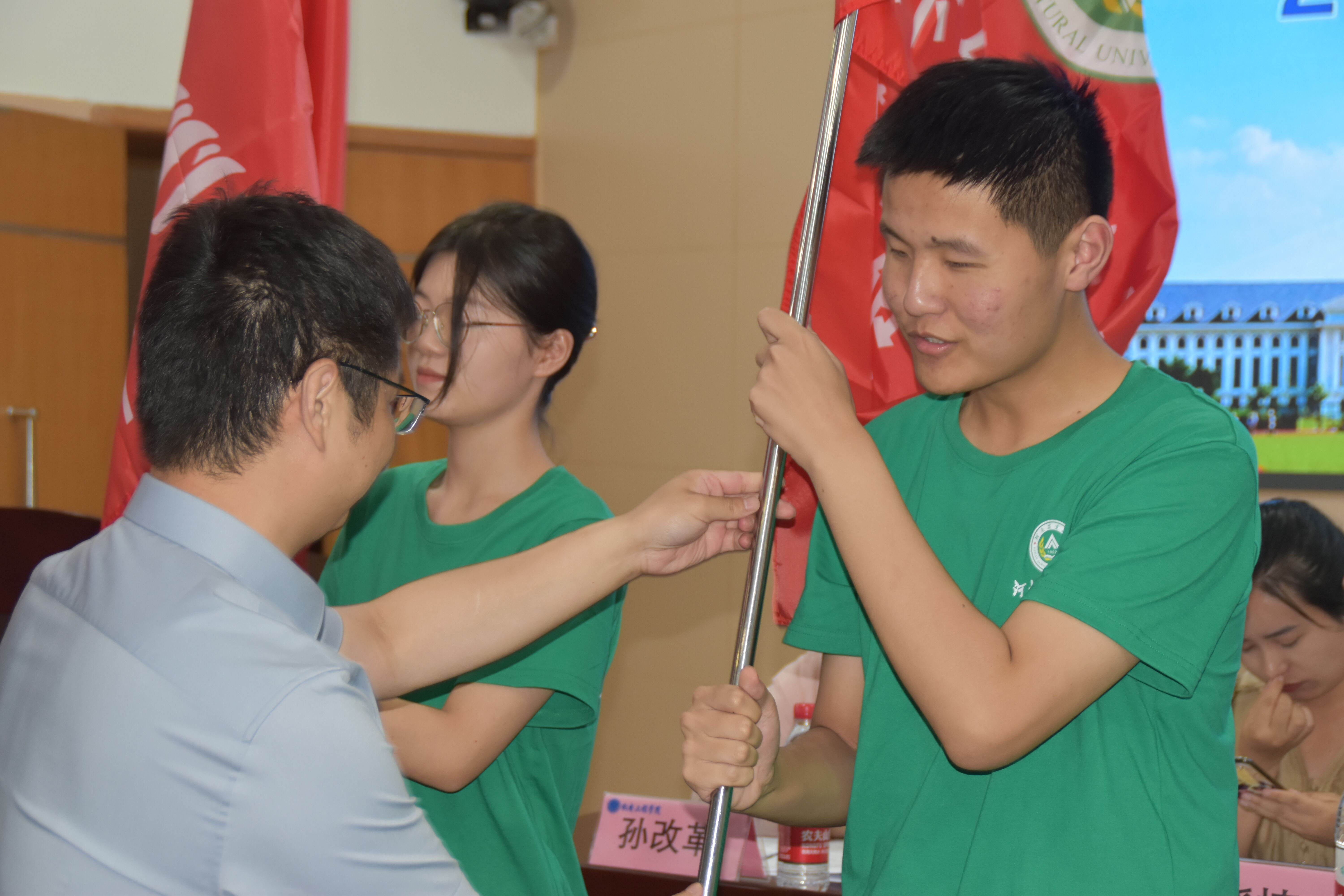 会上,胡亭亭宣读了《2023年黄网 暑期社会实践文件》。社会实践团队代表刘乐斌进行发言,他首先感谢学校和黄网 对社会实践团队的大力支持,向大家介绍社会实践活动是大学生活不可或缺的一部分,有利于培养自我创新意识、社会责任意识,激发勤奋学习、奋发成才的积极性和主动性,让实践检验理论成果。最后宋晶为校重点团队授旗并合影留念。