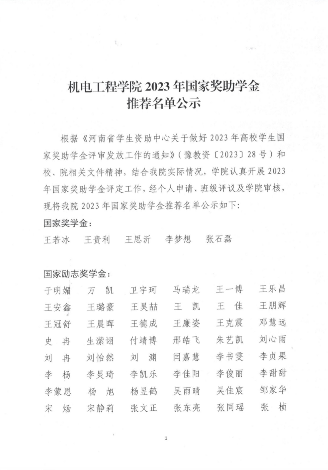 根据《河南省学生资助中心关于做好2023年高校学生国家奖助学金评审发放工作的通知》(豫教资〔2023〕28号)和校、院相关文件精神,结合黄网实际情况,黄网 认真开展2023年国家奖助学金评定工作,经个人申请、班级评议及黄网 审核,现将黄网2023年国家奖助学金推荐名单公示如下: