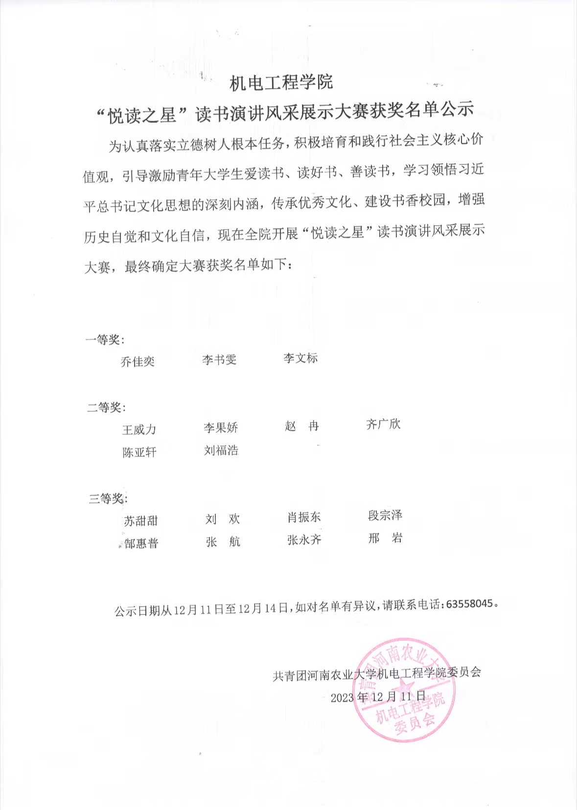 为认真落实立德树人根本任务,积极培育和践行社会主义核心价值观,引导激励青年大学生爱读书、读好书、善读书,学习领悟习近平总书记文化思想的深刻内涵,传承优秀文化、建设书香校园,增强历史自觉和文化自信,现在全院开展“悦读之星”读书演讲风采展示大赛,最终确定大赛获奖名单如下: